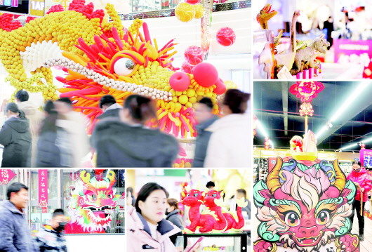 2024年是甲辰龙年。龙是祥瑞和高贵的象征,以承载有关天地、宇宙、人生的理想寄寓和对吉祥福祉的祈愿梦想。作为一个图腾,龙是中国人崇拜的瑞兽,成为中华民族精神的象征,守护着国泰民安,滋养着物阜民丰。百节年为首,四季春为先。龙年春节来临,皋城大街小巷,各种“龙元素”占据“C位”,“龙气”满满。 左上图:六安万达广场,一条用彩色气球制作的生肖“龙”盘悬空中栩栩如生。左下图左一:城区皖西路,一家临街门店粘贴的“龙”彰显出年味十足的消费场景。左下图左二:城区新都会环球广场商场内,随处可见的卡通龙摆件引人注目。右上图:城区一家娱乐场内,恐龙玩具形态各异。右下图:城区某大型超市里,龙头造型醒目,寓意生意兴隆。 本报记者 田凯平 摄