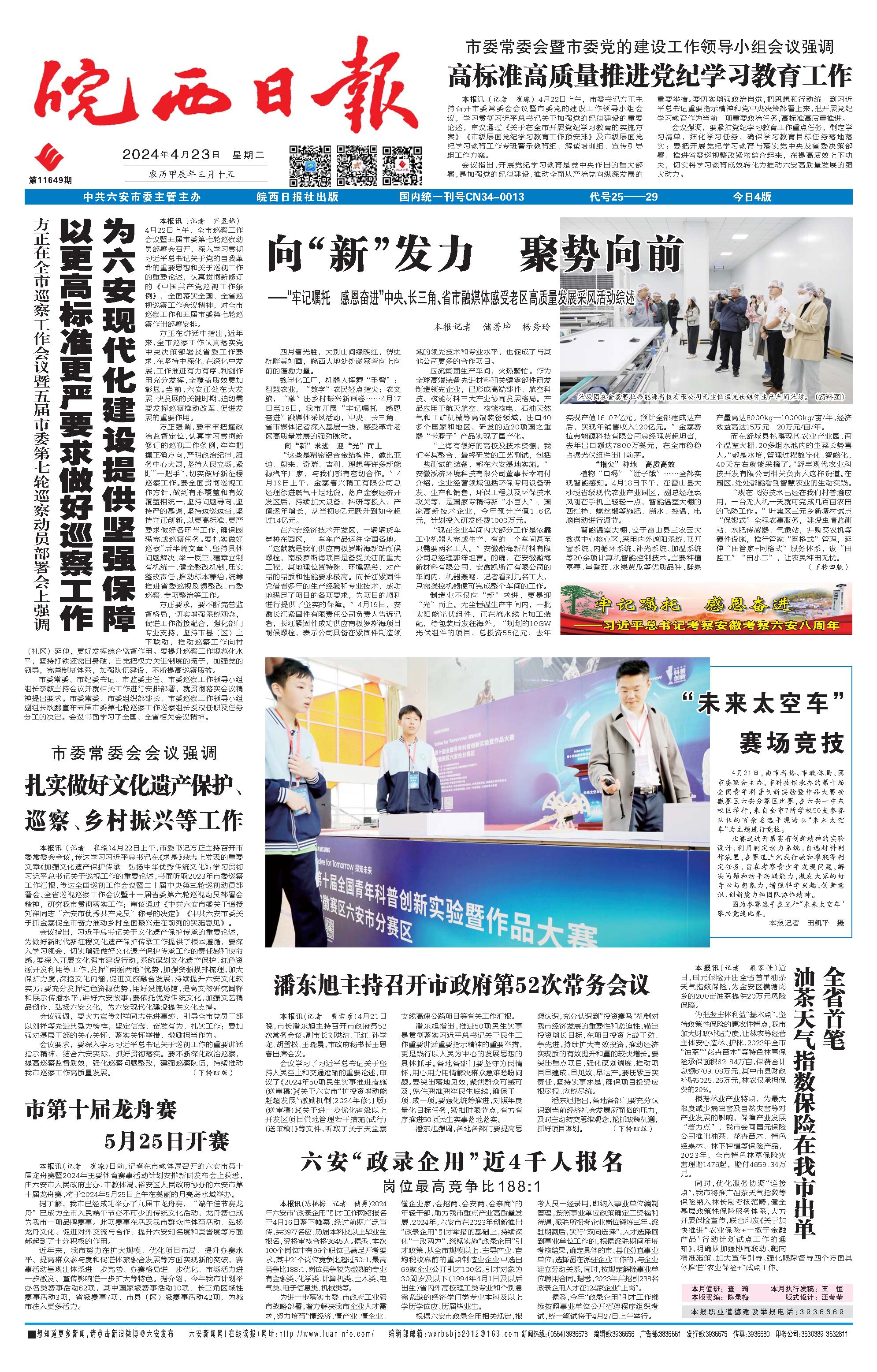 本报讯(记者 崔璨)4月22日上午,市委书记方正主持召开市委常委会会议,传达学习习近平总书记在《求是》杂志上发表的重要文章《加强文化遗产保护传承 弘扬中华优秀传统文化》;学习贯彻习近平总书记关于巡视工作的重要论述,书面听取2023年市委巡察工作汇报,传达全国巡视工作会议暨二十届中央第三轮巡视动员部署会、全省巡视巡察工作会议暨十一届省委第六轮巡视动员部署会精神,研究我市贯彻落实工作;审议通过《中共六安市委关于追授刘祥同志“六安市优秀共产党员”称号的决定》《中共六安市委关于抓金寨促全市奋力推动乡村全面振兴走在前列的实施意见》。 会议指出,习近平总书记关于文化遗产保护传承的重要论述,为做好新时代新征程文化遗产保护传承工作提供了根本遵循,要深入学习领会,切实增强做好文化遗产保护传承工作的责任感和使命感。要深入开展文化强市建设行动,系统谋划文化遗产保护、红色资源开发利用等工作,发挥“两源两地”优势,加强资源摸排梳理,加大保护力度,深挖文化内涵,促进文旅融合发展,持续提升六安文化软实力;要充分发挥红色资源优势,用好设施场馆,提高文物研究阐释和展示传播水平,讲好六安故事;要依托优秀传统文化,加强文艺精品创作,弘扬六安文化,为六安现代化建设提供文化支撑。 会议强调,要大力宣传刘祥同志先进事迹,引导全市党员干部以刘祥等先进典型为榜样,坚定信念、奋发有为、扎实工作;要加强对基层干部的关心关怀,落实关怀举措,激励担当作为。 会议要求,要深入学习习近平总书记关于巡视工作的重要讲话指示精神,结合六安实际,抓好贯彻落实。要不断深化政治巡察,提高巡察监督质效,强化巡察问题整改,建强巡察队伍,持续推动我市巡察工作高质量发展。 (下转四版)