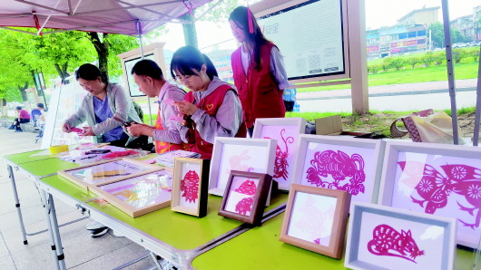 5月19日,金寨县梅山镇在红军广场开展“畅游中国 幸福生活”中国旅游日非遗展示主题活动,充分展示金寨县文化旅游资源,让居民和游客共享旅游发展成果,领略金寨的独特风采。 本次活动邀请“非物质文化遗产”代表性传承人王馨老师展示国风服饰产品的刺绣工艺品的绣法,还邀请县级民间非遗剪纸传承人孙润老师为大家现场教学剪纸。一件件栩栩如生、精美别致的小虎头鞋、小老虎的艾草挂件、精美的肚兜、虎头帽、汉服;一幅幅惟妙惟肖的十二生肖剪纸作品展示在游客面前,令他们争相观摩、赞叹不已。 叶夏欣 文/图
