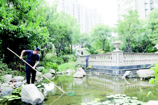 “老李,桥底下有根树枝你能不能看到?” 9月2日一早,金安区三里桥街道友谊社区骏景豪庭小区物业经理汪洋便和同事一起,在小区景观池处进行水池清理工作,只见他和同事相互配合,用工具打捞池中的杂物,不一会儿就大汗淋漓。 清理后的池面波光粼粼,很快,平静的池水在阳光照耀下仿佛一面镜子,倒映着周围的楼栋、葱郁的绿植和湛蓝的天空。池边精心布置的花卉和景观石,与池水相互映衬,构成了一幅美不胜收的画面……这样一副美好的小区景观图,正是今夏友谊社区党总支和骏景豪庭小区党支部共同努力的结果。 众所周知,景观池作为园林水景的一种,不仅能美化环境,还能通过其流动和变化,为居民提供视觉上的享受和心灵上的宁静。然而,就在上个月,友谊社区在持续开展问需于民走访工作中,收到骏景豪庭小区业主反映的一件“烦心事”:受高温和雨水天气影响,入夏以来,小区内的景观池浮萍、垃圾四处漂流,池水污浊不堪,就连景观池旁四角亭里的纳凉居民都开始逐渐减少。 “居民的需求就是我们努力的方向。”在了解民需、知晓民意后,友谊社区迅速响应,及时对接骏景豪庭小区党支部,并联合物业公司一行,实地走访查看景观池现状:浑浊的池水、漂浮的垃圾、难闻的气味……眼前的一幕幕触动了大家的心,社区当机立断,督促物业公司即刻安排人员,对池塘内垃圾、浮萍、淤泥等杂物进行清理,并在清理后及时进行换水。 就这样,如火如荼的景观池“大扫除”开始了,小区党支部联合物业公司顶着炎炎烈日,组织人员对景观池塘里的杂物进行全面打捞,随后利用抽水泵对景观池进行“大换水”。经过清理,景观池塘焕然一新,池底鹅卵石清晰可见。“清洁完毕后,我们保持着每周一次的水面清理工作,定期清理池塘里的垃圾、淤泥等。”汪洋告诉记者,物业公司还向池水中投放生物环保制剂,防止浮萍“卷土重来”。 “为确保清理成效,社区还不定期展开‘回头看’行动,组织小区党支部人员前往景观池进行随机回访,及时掌握了解居民满意程度。”友谊社区工作人员孙全仲表示,为让美景长留,小区党支部还联合物业服务公司,不定期在业主群宣传,与小区居民携手制止在景观池内洗衣服、洗菜等不文明行为。“今后,友谊社区也将持续关注民生、守望民心、回应民意,用实干和担当,绘出服务居民的‘幸福图’。”