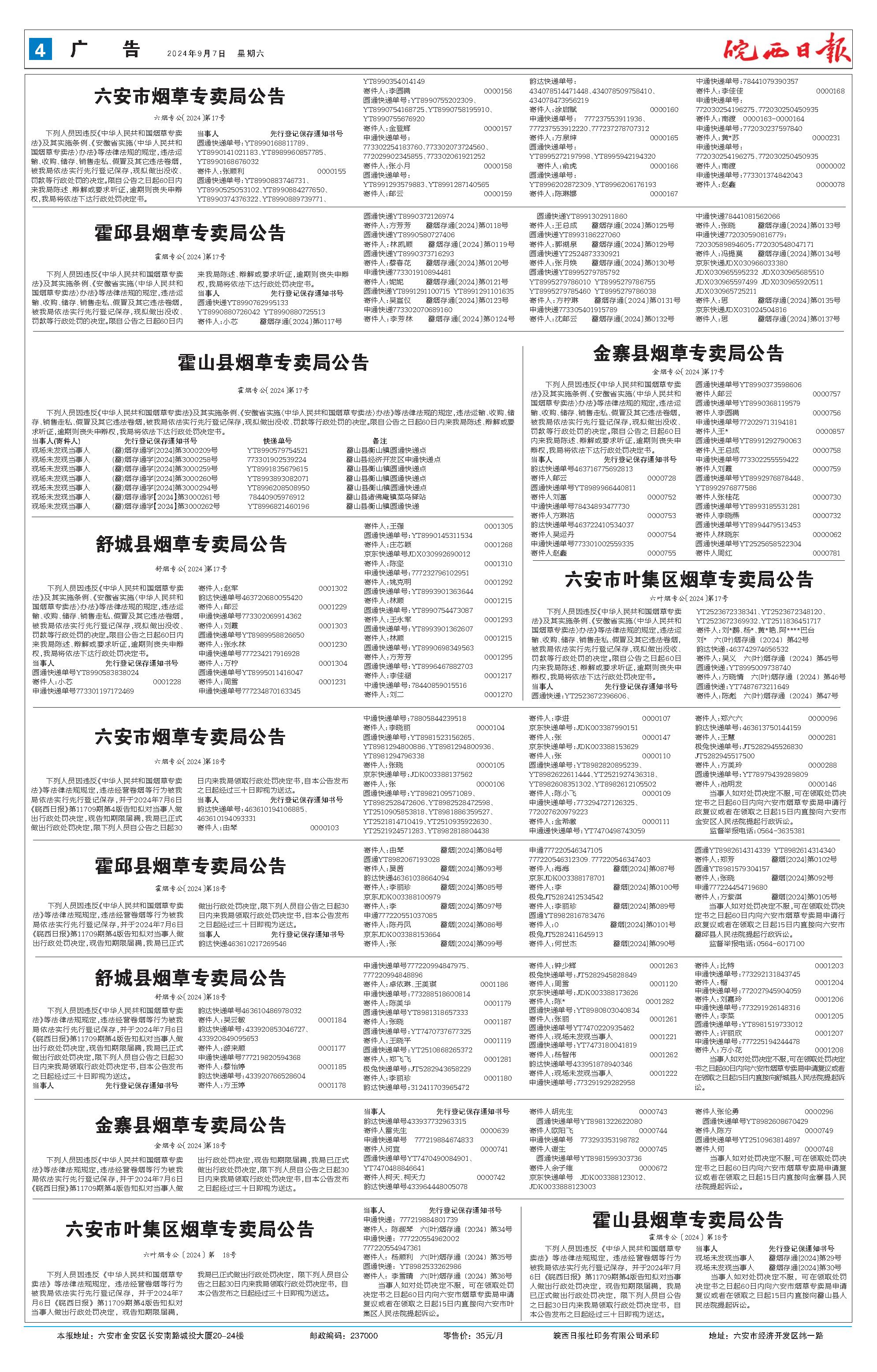 下列人员因违反《中华人民共和国烟草专卖法》及其实施条例、《安徽省实施〈中华人民共和国烟草专卖法〉办法》等法律法规的规定,违法运输、收购、储存、销售走私、假冒及其它违法卷烟,被我局依法实行先行登记保存,现拟做出没收、罚款等行政处罚的决定。限自公告之日起60日内来我局陈述、辩解或要求听证,逾期则丧失申辩权,我局将依法下达行政处罚决定书。 当事人 先行登记保存通知书号 圆通快递单号:YT8990168811789、 YT8990141021183、YT8989960857785、 YT8990168676032 寄件人:张顺利 0000155 圆通快递单号:YT8990883746731、 YT8990525053102、YT8990884277650、 YT8990374376322、YT8990889739771、 YT8990354014149 寄件人:李圆满 0000156 圆通快递单号:YT8990755202309、 YT8990754168725、YT8990758195910、 YT8990755676920 寄件人:金登辉 0000157 申通快递单号: 773302254183760、773302073724560、 772029902345855、773302061921252 寄件人:张小月 0000158 圆通快递单号: YT8991293579883、YT8991287140565 寄件人:邮云 0000159 韵达快递单号: 434078514471448、434078509758410、 434078473956219 寄件人:涂启赋 0000160 申通快递单号: 777237553911936、 777237553912220、777237278707312 寄件人:方泉绅 0000165 圆通快递单号: YT8995272197998、YT8995942194320 寄件人:俞虎 0000166 圆通快递单号: YT8996202872309、YT8996206176193 寄件人:陈琳娜 0000167 中通快递单号:78441079390357 寄件人:李佳佳 0000168 申通快递单号: 772030254196275、772030250450935 寄件人:南渡 0000163-0000164 申通快递单号:772030237597840 寄件人:黄*苏 0000231 申通快递单号: 772030254196275、772030250450935 寄件人:南渡 0000002 申通快递单号:773301374842043 寄件人:赵鑫 0000078