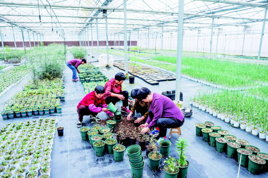 10月31日,在银湖街道唐家坞村禾美农旅融合式的共富工坊内,村民在进行盆栽移苗。