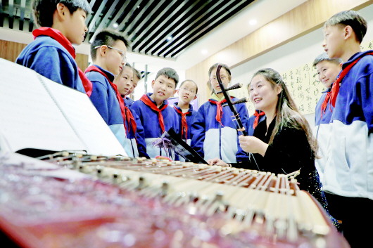 11月12日,市文化馆“月光音乐盒”合乐乐团的老师在给裕安区紫荆小学的同学们普及音乐乐理、演奏形式等知识。 当日,市文化馆联合裕安区紫荆小学共同举办“月光音乐盒·高雅艺术进校园”活动,合乐乐团的老师们倾心演绎了《云宫迅音》《兰亭序》《青花瓷》《一笑江湖》《你笑起来真好看》等10首大家耳熟能详的曲目,并与师生互动普及音乐知识,推广民族传统文化,让大家亲近艺术、接触艺术,提升艺术素养,以美育浸润校园、助力成长,在一场别开生面的视听艺术盛宴中感受高雅艺术的魅力。 本报记者 田凯平 摄