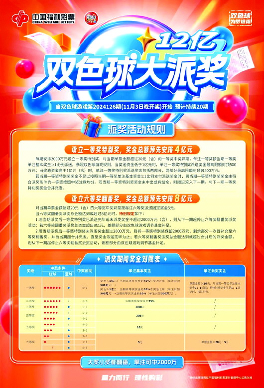 为回馈广大购彩者的爱心支持,一年一度的双色球大派奖再度开启,大奖小奖都翻番,单注可中2000万元。 派奖时间 自双色球游戏第2024126期2024年11月3日晚开奖开始,预计持续20期。 派奖亮点 派奖奖金约12亿元,大奖小奖都翻番,单注可中2000万元。 派奖规则 本次双色球派奖活动设立一等奖特别奖和六等奖翻番奖。一等奖特别奖,奖金总额预先安排4亿元;六等奖翻番奖,奖金总额预先安排8亿元。 一等奖特别奖 每期安排2000万元设立一等奖特别奖,对当期单票金额超过20元(含)的一等奖中奖彩票,每注一等奖按当期一等奖单注基本奖金1:1比例派送。参照双色球游戏规则,当奖池资金低于1亿元时,单注一等奖特别奖派送奖金最高限额封顶500万元;当奖池资金高于1亿元(含)时,单注一等奖特别奖派送奖金包括两部分,两部分最高限额封顶各500万元。 若当期一等奖特别奖奖金不足以按照当期一等奖单注基本奖金1:1比例支付派送奖金时,则当期一等奖特别奖奖金由符合派奖条件的一等奖按照中奖注数均分。若当期一等奖特别奖奖金未中出或有结余,则顺延滚入下一期,与下一期一等奖特别奖奖金合并派发。 六等奖翻番奖 对当期单票金额超过20元(含)的六等奖中奖彩票按每注六等奖派送固定奖金5元。 当六等奖翻番奖派奖总金额达到或超过8亿元时,特别规定如下: 若当期派奖后一等奖特别奖已派送完毕或未派发奖金不超过2000万元(含),则从下一期起停止六等奖翻番奖派奖活动;若六等奖翻番奖派奖总资金超出8亿元,差额部分由双色球游戏调节基金补足。 若当期派奖后一等奖特别奖未派发奖金超过2000万元,则将一等奖特别奖保留2000万元,剩余部分一次性补充至六等奖翻番奖,并自当期起合并派发,直至奖金派送完毕为止;若六等奖翻番奖派奖总金额达到或超过合并后的派奖金额,则从下一期起停止六等奖翻番奖派奖活动,差额部分由双色球游戏调节基金补足。 资金来源 本次派奖活动所需资金合计约12亿元,从双色球游戏调节基金支出。 深秋尚暖,幸运启航。善举温暖人心,爱心助力梦想。双色球12亿元大派奖欢迎您的参与,感恩您的支持。福彩双色球,为梦造福。