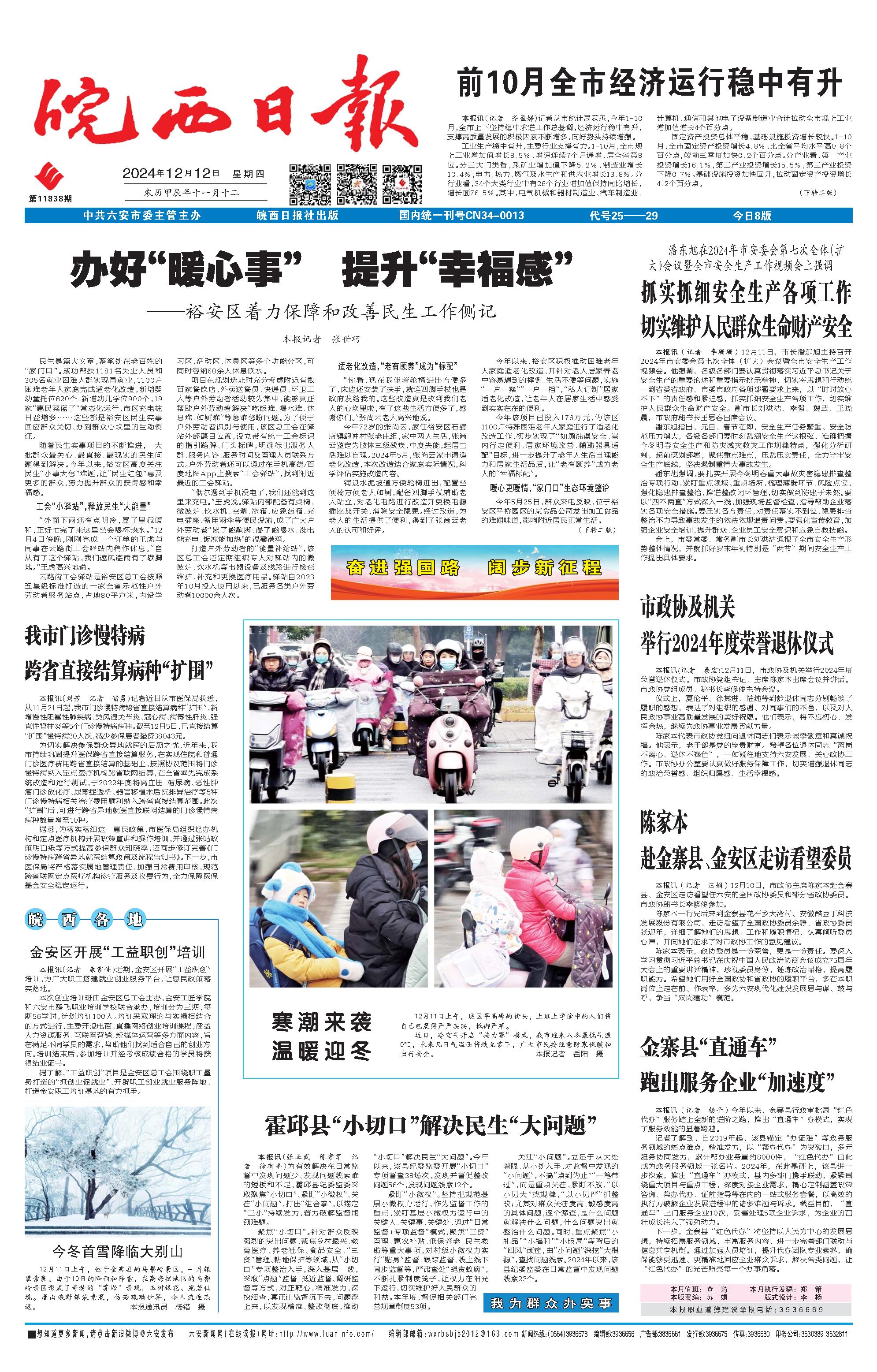 本报讯(记者 齐盈娣)记者从市统计局获悉,今年1-10月,全市上下坚持稳中求进工作总基调,经济运行稳中有升,支撑高质量发展的积极因素不断增多,向好势头持续增强。 工业生产稳中有升,主要行业支撑有力。1-10月,全市规上工业增加值增长8.5%,增速连续7个月递增,居全省第8位。分三大门类看,采矿业增加值下降5.2%,制造业增长10.4%,电力、热力、燃气及水生产和供应业增长13.8%。分行业看,34个大类行业中有26个行业增加值保持同比增长,增长面76.5%。其中,电气机械和器材制造业、汽车制造业、计算机、通信和其他电子设备制造业合计拉动全市规上工业增加值增长4个百分点。 固定资产投资总体平稳,基础设施投资增长较快。1-10月,全市固定资产投资增长4.8%,比全省平均水平高0.8个百分点,较前三季度加快0.2个百分点。分产业看,第一产业投资增长16.1%,第二产业投资增长15.5%,第三产业投资下降0.7%。基础设施投资加快回升,拉动固定资产投资增长4.2个百分点。 (下转二版) (上接一版) 市场消费平稳增长,近六成商品保持增长。1-10月,全市限额以上消费品零售额增长5.0%,比全省平均水平高0.1个百分点。按经营单位所在地分,城镇消费品零售额增长5.4%,乡村消费品零售额下降2.8%。分消费形态看,全市餐饮收入下降1.3%,商品零售增长5.7%。从商品类别看,全市21类限额以上批发和零售业商品中,12类商品零售额实现增长,增长面57.1%,其中汽车类零售额增长8.5%,新能源汽车零售额增长63.8%;家用电器和音像器材类零售额增速年内首次实现由负转正,增长0.3%,较前三季度加快4.2个百分点。 财政收支总体平稳,金融信贷保持增长。1-10月,全市一般公共预算收入156.5亿元,增长2.2%;一般公共预算支出484.1亿元,下降3.7%。10月末,全市金融机构本外币存款余额4557.7亿元,增长8.6%,其中住户存款3465.2亿元,住户存款占各项存款比重为76.0%;贷款余额4107.5亿元,增长8.0%,其中住户贷款1662.4亿元,住户贷款占各项贷款比重为40.5%。