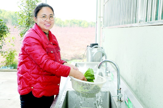 图为12月6日,金安区张店镇柽树庵村村民鲍玉正高兴地使用自来水洗菜。