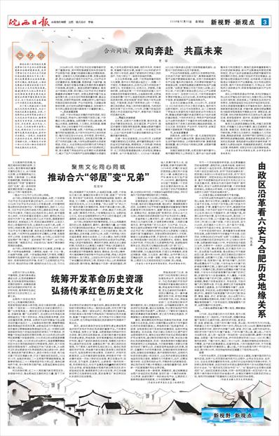 作为一个历史地理学研究者,往往更偏重由历史地理视野,透视历史上地域与地域、地域与社会人群间的人地互动关系。我把清朝以前王朝时代两个政区空间的关系,称作“历史的地缘关系”,把民国以来到2000年间发生的关系,称为“现代的纽带联系”,而把本世纪以来互相成就的政治关系、基于市场逻辑的经济依存互补关系以及文化交流互融关系,借助当代流行语称作城市“都市圈”概念,即当下合肥所讲的都市圈、六安所强调的同城化。依据此分析架构,今天主要讲六安市和合肥市之间的“历史的地缘关系”。 一、江淮之间山水相依的两个千年古城。 六安市和合肥市两地同为江淮之间的淮西大别山地域,是中华文明史上建置早、治所建城早的江淮千年古城。今天的六安市是以原六安县为中心地虚盈、扩展,建置为当代六安市。溯源其历史政区沿革,六安为实打实的千年古城。春秋时期鲁文公五年(前622)为楚国所灭,废为楚国六邑。即便从此年开始计算,至今已有2646年。秦王政二十四年(前223)灭楚,以六邑建六县。西汉的汉武帝元狩二年(前121)建六安国,六安之名出现,至今2145年。东汉建武十三年(37),改六县为六安县,六安首次作为县名之专名,至今时长1988年。 六安专名沿用时间长,具有重要历史影响度和知名度。合肥市同样作为安徽省千年古城,它的历史,如果由《史记》中出现“合肥”之名算起,仅以《史记》成稿约在汉武帝征和三年(公元前90)保守计算,合肥建城时间逾2107年,专名沿用至今起码2114年。如果保守一点统计,以西汉武帝时改淮南王国为九江郡,辖合肥县等。东汉建武元年(25年),改合肥县为合肥侯国,是合肥独立作为国家政区三级,距今有1999年。西汉王朝政区分层的州郡国时期,合肥属于九江郡,六安市属地分别有六安国领六县、阳泉等5个县,皆为扬州辖下。东汉时期合肥属扬州下九江郡,六安市地与今天辖下的舒城县同属庐江郡。三国时合肥为扬州辖下的淮南郡,六安属庐江郡。西晋时合肥属扬州辖下的淮南郡,六安与今天的舒城等属于扬州辖下的庐江郡。东晋时因为六安县被撤销,并入灊县,六安其地仍属扬州辖下的庐江郡。合肥则一直属扬州之淮南郡。隋朝六安其地变动大,专名改变,为扬州辖下庐江郡淠水县、开化县,唐朝又改为淮南道寿州寿春郡之盛唐县,五代时期属寿州辖下,经吴、南唐至周,专名改变。合肥在隋朝为扬州辖下庐江郡(庐州),唐朝则为淮南道辖下庐州庐江郡(领合肥、慎县、巢县、庐江、舒城5县),且以合肥为中心地的领县属地范围初成。宋朝六安市与合肥市,同属淮南西路辖下,六安专名回归,短暂建置有六安军,合肥则属庐州(保信军)。 二、六安与合肥政区趋于同一的元、明和清初时期。 1279年,忽必烈建立的大元灭南宋,是为少数民族新建之大一统政权。六安和合肥,同属河南省辖下淮西江北道庐州路。其时的庐州路,直领合肥、梁县、舒城3县,又领六安州(辖六安县、英山县)、和州和无为州3州8县。明朝建立之初六安县属庐州府六安州。明弘治七年(1494年)属南京直隶即南京直隶庐州府,其时庐州府辖下合肥、舒城、庐江3县,合肥为府治所在。同时庐州府下领无为州(辖下巢县)、六安州(辖下英山县、霍山县)。六安州与合肥关系,进入同一省区同一府治的同一政区治理时期。康熙六年安徽建省,合肥县一直为府治所在地,庐州府在顺治年间(1644—1661年)属江南布政使司,下辖六安州。雍正二年(1724年),因清政府赋税征收等实际工作需要,由户部主动奏请提出,经皇帝旨准,六安州脱离庐州府,升为安徽省治辖下的直隶州并辖领英山、霍山2县。六安与合肥是为两个平行的并立政区,距今有300年,而在同省同府政区建置之下前后有445年。 结语 六安市与合肥市,正在沿着中国特色社会主义道路,向着中国式现代化城市迈进。在两个比邻而居的城市现代化过程中,必然会发生政治、经济、文化、社会生活等多重联系和关系。当我们对这些关联性作深度分析时,不妨转化思考的维度,放在历史的长时段去透视和思考六安与合肥毗邻政区的分分合合,“分”是历史风云际会中的“分”,“合”是经济社会发展水到渠成的“合”。由政区沿革变迁视角,对同一自然区甚至同一政区内的六安、合肥两个城市做长时段的历史地理分析,会增加对事物内在联系的历史认知,有利于时间维度下把握城市之间互动关系的历史进程。 (作者系安徽大学历史学院教授)