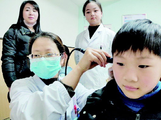 图为医务人员为群众进行听力检测。