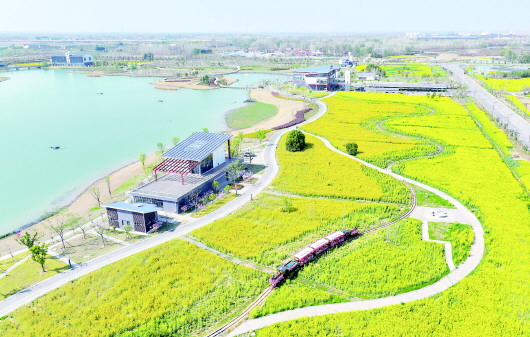 3月26日,金安区城北镇王湾村,一列观光小火车徜徉在油菜花田里,与村庄、景观湖、亲水栈道等相映成景。