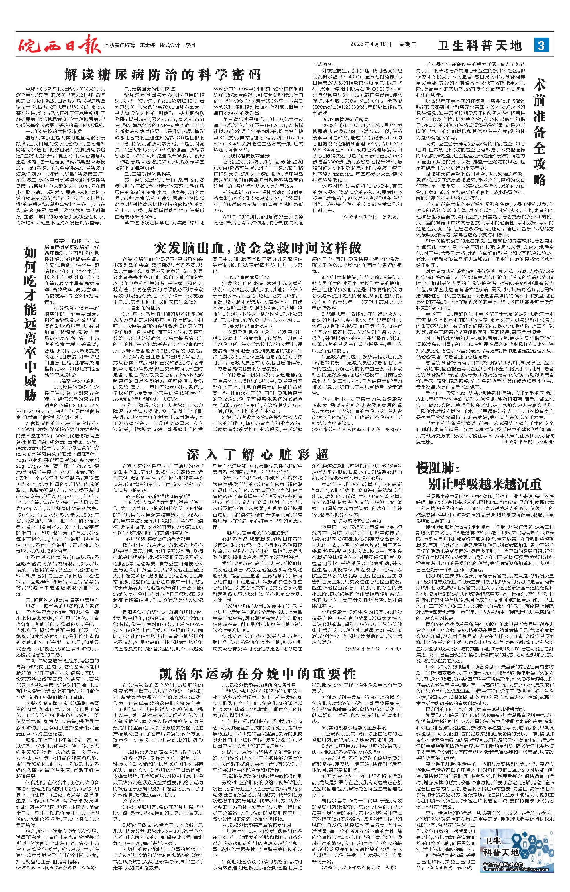 全球每8秒就有1人因糖尿病失去生命,这个看似“甜蜜”的疾病已成为21世纪最严峻的公共卫生挑战。国际糖尿病联盟最新数据显示,我国糖尿病患者已达1.4亿,更令人警惕的是,约3.5亿人正处于糖尿病前期。了解糖尿病、预防糖尿病、科学管理糖尿病,已经成为每个人都需要关注的重要健康课题。 一、血糖失控的生物学本质 糖尿病本质上是人体的能量运输系统故障。当我们摄入碳水化合物后,葡萄糖如同等待派送的“能源包裹”,需要胰岛素这把“生物钥匙”开启细胞大门。但在糖尿病患者体内,这一过程面临两种典型故障模式:一是1型糖尿病。免疫系统误将胰岛β细胞识别为“入侵者”,导致“胰岛素工厂”永久停工。这类患者需终身依赖外源性胰岛素,占糖尿病总人群的5%-10%,多在青少年期发病。二是2型糖尿病。呈现“钥匙生锈”(胰岛素抵抗)和“产能不足”(β细胞衰竭)的双重困境。其典型症状“三多一少”(多饮、多食、多尿、体重下降)实为机体代谢警报:血液中堆积的葡萄糖引发渗透性利尿,而细胞却因能量不足持续发出饥饿信号。 二、致病因素的协同效应 糖尿病是基因与环境共同作用的结果。父母一方患病,子女风险增加40%;若双方患病,风险跃升至70%。但环境因素才是点燃遗传火种的“引信”:一是内脏脂肪陷阱:腰围超标(男≥90cm,女≥85cm)者,脂肪细胞释放的TNF-α等炎症因子会阻断胰岛素信号传导。二是升糖风暴:精制碳水化合物的血糖生成指数(GI)是粗粮的2-3倍,持续刺激胰岛素分泌。三是肌肉流失:久坐人群每减少10%骨骼肌量,胰岛素敏感性下降11%。四是昼夜节律紊乱:夜班工作者患病风险增加37%,褪黑素异常直接影响β细胞功能。 三、三级防御体系构建 第一道防线是饮食重构。采用“211餐盘法则”:每餐2拳非淀粉类蔬菜+1拳优质蛋白+1拳低GI主食(荞麦、藜麦等)。研究表明,这种饮食结构可使糖尿病风险降低40%。特别推荐含抗性淀粉的食物(如冷却的土豆、豆类),其缓释供能特性可使餐后血糖波动降低30%。 第二道防线是科学运动。实施“碎片化运动处方”:每静坐1小时进行3分钟抗阻训练(深蹲/靠墙静蹲),可使葡萄糖转运蛋白活性提升40%。每周累计150分钟中等强度运动(如快走时能说话但不能唱歌),相当于每日8000步的活动量。 第三道防线是精准监测。40岁后建议每年检测糖化血红蛋白(HbA1c),该指标能反映近3个月血糖平均水平,比空腹血糖早6年发现异常。糖尿病前期(HbA1c 5.7%-6.4%)人群通过生活方式干预,进展风险可降低58%。 四、现代控糖技术全景 智能监测系统。持续葡萄糖监测(CGM)设备可生成72小时“血糖地图”,精确识别饮食、运动对血糖的影响。闭环胰岛素泵通过实时血糖数据自动调整胰岛素输注量,使血糖达标率从35%提升至72%。 药物革新。GLP-1受体激动剂(如司美格鲁肽):智能调节胰岛素分泌,延缓胃排空,临床试验显示其心血管事件风险降低26% SGLT-2抑制剂。通过尿液排出多余葡萄糖,兼具心肾保护作用,使心衰住院风险下降31%。 并发症防控。足部护理:使用温度计控制洗脚水温(37-40℃),选择无骨缝袜,每日用带放大镜的检查仪观察足底。眼底监测:采用光学相干断层扫描(OCT)技术,可比传统检查早6个月发现微血管渗漏。神经保护:甲钴胺(1500μg/日)联合α-硫辛酸(600mg/日)可改善60%患者的周围神经病变症状。 五、疾病管理范式转变 2023年《柳叶刀》研究证实,早期2型糖尿病患者通过强化生活方式干预,停药缓解率可达61%。通过“饮食记录APP+动态血糖仪”实施精准管理,6个月内HbA1c从8.6%降至5.9%,成功逆转糖尿病前期状态。值得关注的是:每日步行量从3000步增至8000步,胰岛素敏感性提升25%。睡眠时间从5小时延长至7小时,空腹血糖平均下降0.4mmol/L。腰围每减少5cm,糖尿病风险降低15%。 这场对抗“甜蜜危机”的战役中,真正的敌人是对代谢风险的忽视。糖尿病防控没有“后悔药”,但永远不缺乏“现在进行时”。记住:每个微小的改变都在重塑你的代谢未来。 (六安市人民医院 张茂苗)