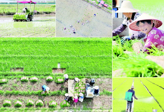 6月16日,裕安区苏埠镇范大塘村,一台插秧机在田间来回穿梭,阵阵轰鸣声中一株株嫩绿的秧苗整整齐齐撒落田间(左上图左一)。 眼下,正值夏种关键时节,我市各地农民抢抓农时,针对农田地域实际积极采取人工与机械化相结合、依托农业专业合作社“代育代插”等方式,有序高效推进水稻秧苗栽插作业,确保种足种满,为全年粮食丰产丰收打下坚实基础。 左上图左二:6月15日,裕安区江家店镇一处小块田间,农民进行手工栽插秧苗。 左下图:6月16日,位于裕安区苏埠镇戚桥村的全国(裕安区)水稻绿色高产高效样板区,农民在起秧、运秧。 右上图:6月16日,裕安区苏埠镇一处育秧基地,捧着即将栽植的水稻秧苗,农民的脸庞绽放出丰收的希望。 右下图:6月16日,裕安区苏埠镇,田间地头忙碌的身影交织成夏日农耕的生动图景。 本报记者 田凯平 摄