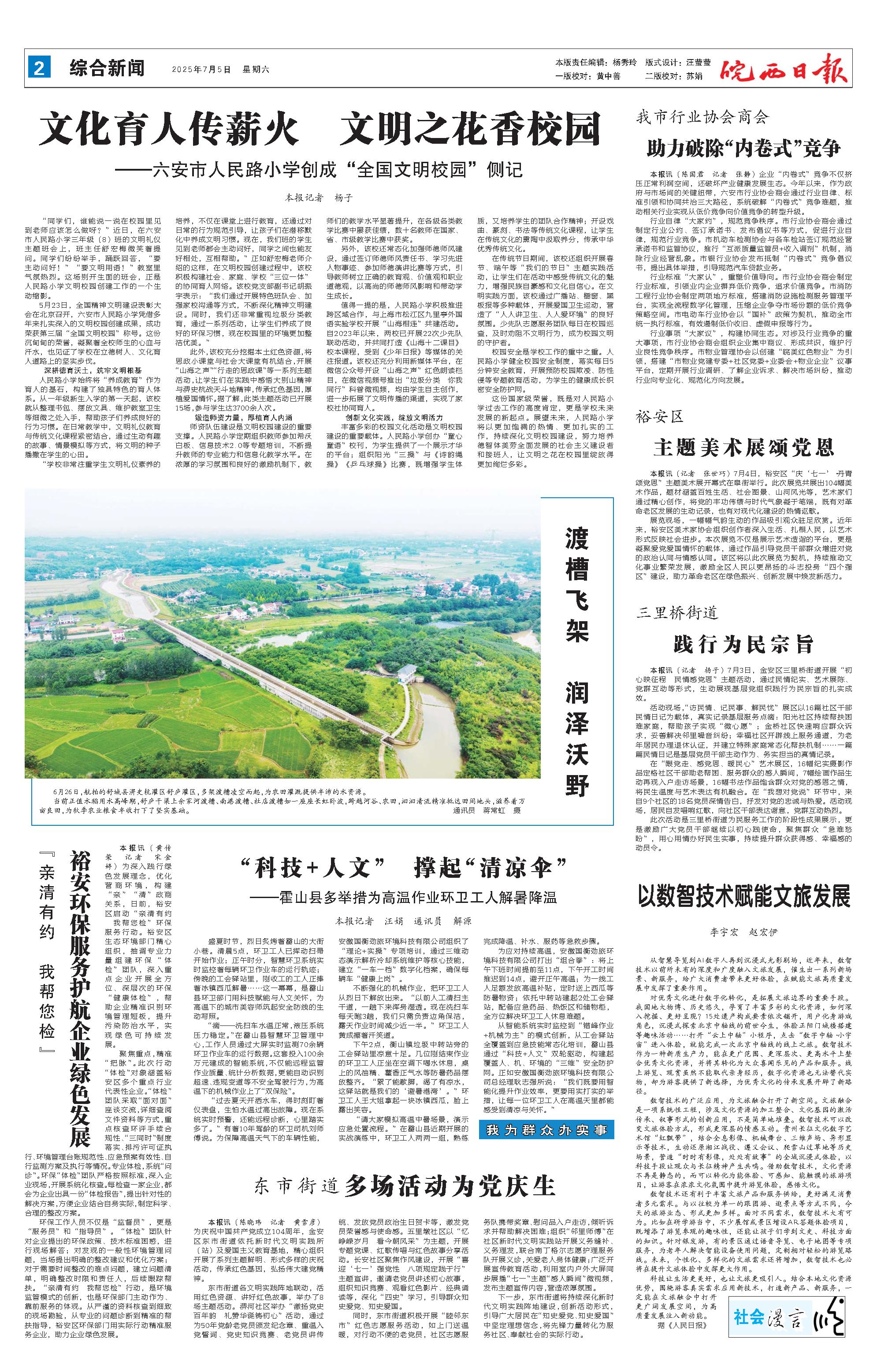 本报讯(记者 张世巧)7月4日,裕安区“庆‘七一’·丹青颂党恩”主题美术展开幕式在皋街举行。此次展览共展出104幅美术作品,题材涵盖百姓生活、社会图景、山河风光等,艺术家们通过精心创作,将党的丰功伟绩与时代气象凝于笔端,既有对革命老区发展的生动记录,也有对现代化建设的热情讴歌。 展览现场,一幅幅气韵生动的作品吸引观众驻足欣赏。近年来,裕安区美术家协会组织创作者深入生活、扎根人民,以艺术形式反映社会进步。本次展览不仅是展示艺术造诣的平台,更是凝聚爱党爱国情怀的载体,通过作品引导党员干部群众增进对党的政治认同与情感认同。该区将以此次展览为契机,持续推动文化事业繁荣发展,激励全区人民以更昂扬的斗志投身“四个强区”建设,助力革命老区在绿色振兴、创新发展中焕发新活力。