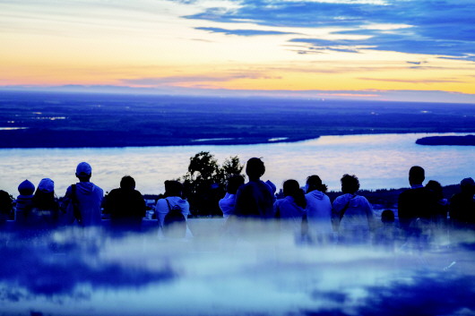 7月4日,游客在抚远市东极阁上观看日出。