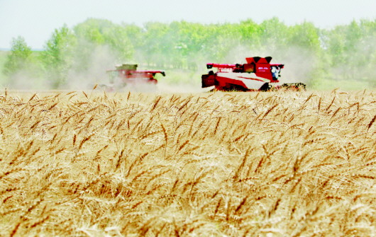 8月5日,位于黑龙江省五大连池市的大庆油田农场调动多台联合收割机抢收小麦。