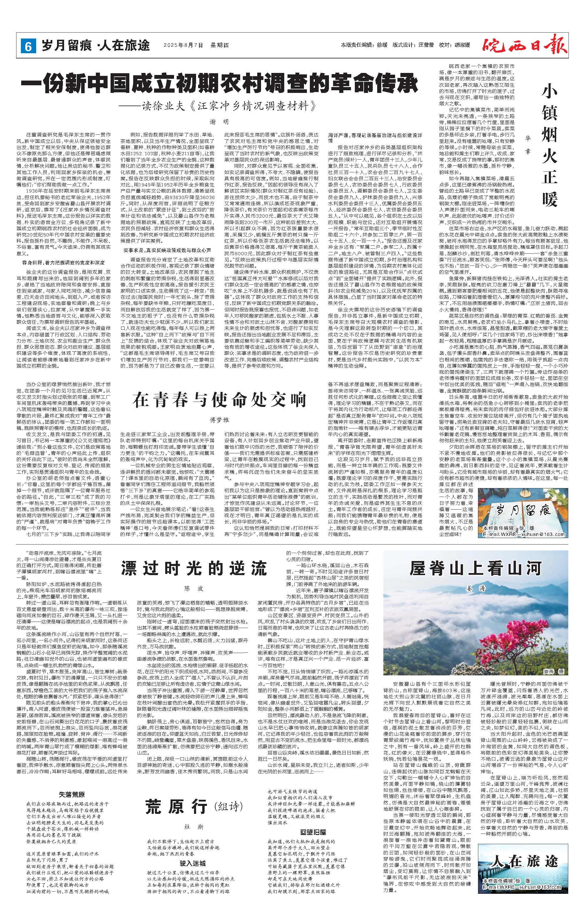 注重调查研究是毛泽东主席的一贯作风。新中国成立以后,中央从保证领袖安全出发,制定了相关安保制度,使得他接近群众不像原先那么方便,但他还是殚思竭虑倾听来自最基层、最普通群众的声音,体察民情,分析解决问题。他让身边的秘书、警卫和其他工作人员,利用回家乡探亲的机会,兼做调查研究,并在一定范围内形成制度,叮嘱他们:“你们帮助我做一点工作。” 1936年在延安时期来到毛泽东主席身边,担任机要秘书的老红军徐业夫,1952年底,受命回到家乡安徽省霍山县开展农村调研,返京后,撰写了《汪家冲乡情况调查材料》,报送毛泽东主席。这份报告以详实的数据、朴实的语言全方位、多视角记录了新中国成立初期皖西农村的社会经济面貌,成为研究20世纪50年代中国农村变革的重要史料。报告质朴自然,不雕饰,不做作,不呆板,不俗套,富有灵气。今天读来,仍拥有其现实意义。 容身田野,着力把握调查的宽度和深度 徐业夫的这份调查报告,是用双脚、双耳和眼睛写出来的。他回到阔别多年的家乡,谢绝了当地政府陪同和食宿安排,直接住到亲戚家,与家人同吃同住,减少信息偏差,白天走访田间地头,到组入户,或者探访工程建设现场,实地察看和调研;晚上与乡亲们促膝谈心,拉家常,从中掌握第一手实情。他熟悉当地语言与文化,能够深入获取群众信任,为撰写调研报告筑牢基础。 阅读文本,徐业夫以汪家冲乡为调查样本点,内容涵盖了行政区划、人口结构、劳动力分布、土地状况、农业和副业生产、群众负担、群众思想动态、群众对政府建议、基层组织建设等多个维度,体现了高度的系统性,让阅读者能够清晰地看到汪家冲乡在新中国成立初期的全貌。 例如,报告数据详细列举了水田、旱地、茶地面积,以及当年生产情况,全面呈现了春耕、夏种、秋种的作物种类及面积(如春耕水田1252.103亩,秋种小麦211亩等),让我们看到了当年全乡农业生产的全貌,这种数据化的记录方式,不仅为政策制定提供了量化依据,也为后续研究保留了珍贵的历史档案。报告在反映群众负担的时候,采取纵向对比,用1949年至1952年历年全乡粮食生产总产量与实交公粮的具体数据,清晰呈现负担直线减轻趋势,由93830斤降至36036斤。同时,从深度而言,详细说明了征粮方式,从土改前的“累进计征”,到土改后的“按率计征和依法减免”,以及霍山县作为老根据地的照顾政策,直观反映了土地改革后,农民负担减轻、农村经济恢复和群众生活得到改善,为研究新中国成立初期农村经济政策提供了详实案例。 实事求是,真实反映政策成效与群众心声 调查报告充分肯定了土地改革和互助合作运动的积极作用,客观记录了群众情绪的巨大转变。土地改革后,农民摆脱了地主的剥削和繁重的苛捐杂税,生活得到显著改善,生产积极性空前高涨。报告援引农民王家明的口述实录,生动展现了这一转变:“我在过去(指国民党时)一年忙到头,除了苛捐杂税,每年要缺半年粮,只好吃糠吃菜度日,而自解放后我的生活就变了样了,因为第一不交地主的租子了,也没有什么苛捐杂税了,就连功夫也少耽误不少,所以我们家五口人现在也能吃得饱,每年每人可以换上两套新衣服。”这种“自上而下”政策与“自下而上”反馈的结合,体现了徐业夫对政策落地效果的敏锐观察。王家明由衷地坦露心声,“这都是毛主席领导得好,毛主席又号召我们增加生产厉行节约,那我们一定要响应的,因为都是为了自己改善生活,一定要以此来报答毛主席的恩情”。这质朴话语,表达了农民对毛主席和党中央的感恩之情,对“增加生产厉行节约”号召的积极响应,生动呈现了当时农村的新气象,也反映出政策变革对基层民众的深远影响。 同时,对群众意见予以客观、全面收集,如实记录调查所得,不夸大、不隐瞒,使报告具有极高的可信度。例如,当地普遍推行制作红茶,报告反映,“因起初领导没有深入了解该区实际情况(群众对制红茶没有经验),派往技师太少,而技术也不高,由于制茶中又常常遇雨连绵,所以演成坯茶现象严重,降低茶价。有关茶价方面起初收卖嫩茶每市斤实得人民币3200元,最后茶大了天又降雨降低到200元一市斤,这种前后差别太大,所以引起群众不满,因为红茶质量要求很高,采摘又少,能摘五斤黄茶的树只摘一斤红茶,所以价格低茶农生活就没法维持。以后黄茶价格提得又很高,每斤干黄茶能卖人民币8000元,因此群众对于制红茶有些意见。”反映出政策执行过程中与基层实际情况脱节的问题。 建设佛子岭水库,群众积极拥护,不仅表达“祖国真正伟大可爱”“水库修成以后对我们群众生活一定会提高的”的感激之情,也惊叹“水库上不但机器多,就是说话也有了机器”。这体现了群众对政府工作的支持和信任,反映了新中国成立初期党群关系的融洽。但同时报告既报喜也报忧,不忌讳问题,如老年人对移民搬家的顾虑,包括水土不服、人事性情不合和对故土山林不舍、对搬家费用和未来生计的顾虑和担忧等,也进行了如实反映。报告还指出当地副业发展不足和滞后,主要依靠运输和手工编织等简单劳动,缺少其他有效的增收途径。这些体现了徐业夫深入群众、实事求是的调研态度,也为政府进一步改进工作、完善后续政策、调整农村产业结构等,提供了参考依据和方向。 周详严谨,客观记录基层治理与组织建设详情 报告对汪家冲乡