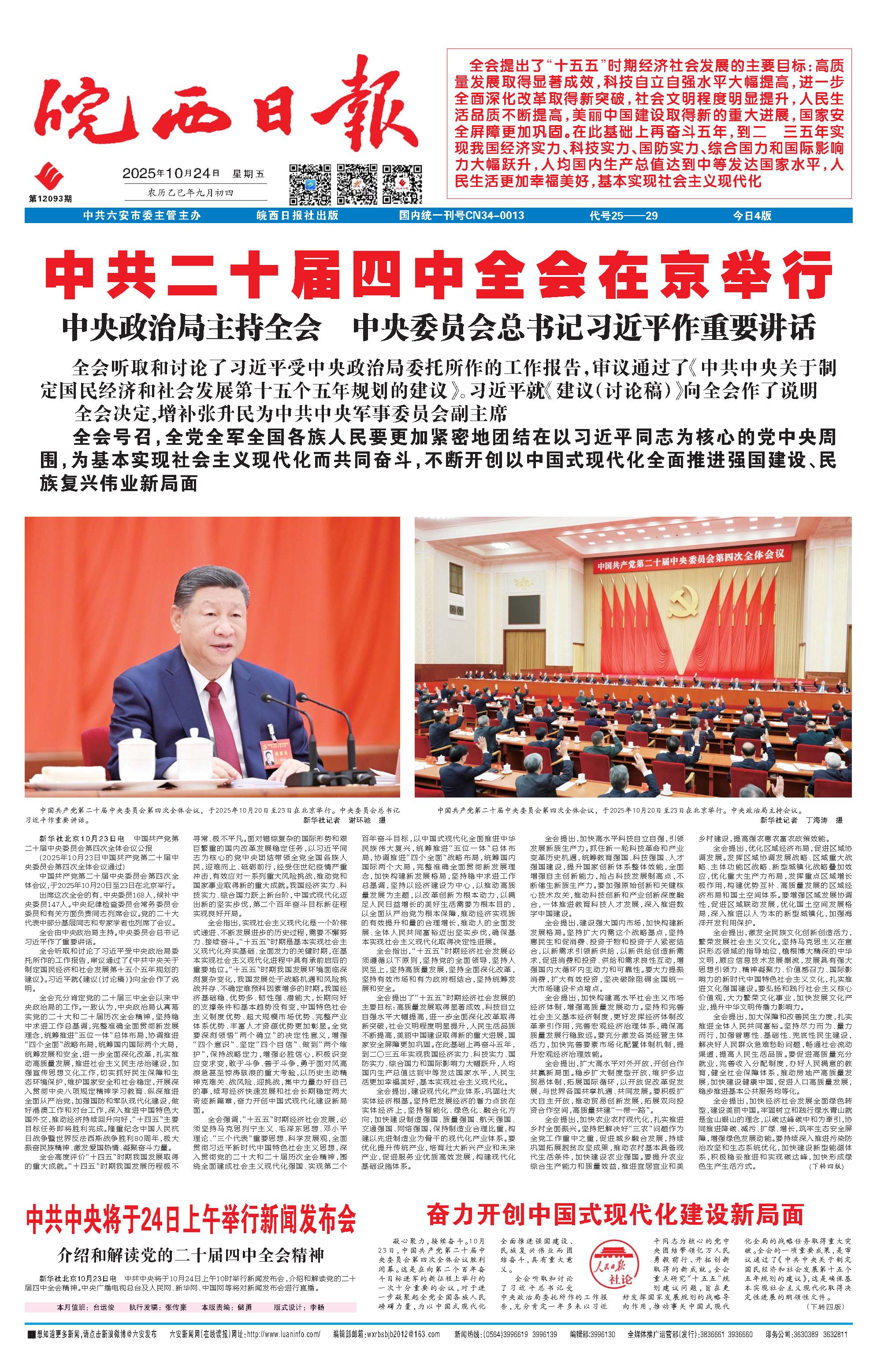 中共二十届四中全会在京举行 中央政治局主持全会 中央委员会总书记习近平作重要讲话 新华社北京10月23日电 中国共产党第二十届中央委员会第四次全体会议公报 (2025年10月23日中国共产党第二十届中央委员会第四次全体会议通过) 中国共产党第二十届中央委员会第四次全体会议,于2025年10月20日至23日在北京举行。 出席这次全会的有,中央委员168人,候补中央委员147人。中央纪律检查委员会常务委员会委员和有关方面负责同志列席会议。党的二十大代表中部分基层同志和专家学者也列席了会议。 全会由中央政治局主持。中央委员会总书记习近平作了重要讲话。 全会听取和讨论了习近平受中央政治局委托所作的工作报告,审议通过了《中共中央关于制定国民经济和社会发展第十五个五年规划的建议》。习近平就《建议(讨论稿)》向全会作了说明。 全会充分肯定党的二十届三中全会以来中央政治局的工作。一致认为,中央政治局认真落实党的二十大和二十届历次全会精神,坚持稳中求进工作总基调,完整准确全面贯彻新发展理念,统筹推进“五位一体”总体布局,协调推进“四个全面”战略布局,统筹国内国际两个大局,统筹发展和安全,进一步全面深化改革,扎实推动高质量发展,推进社会主义民主法治建设,加强宣传思想文化工作,切实抓好民生保障和生态环境保护,维护国家安全和社会稳定,开展深入贯彻中央八项规定精神学习教育、纵深推进全面从严治党,加强国防和军队现代化建设,做好港澳工作和对台工作,深入推进中国特色大国外交,推动经济持续回升向好,“十四五”主要目标任务即将胜利完成。隆重纪念中国人民抗日战争暨世界反法西斯战争胜利80周年,极大振奋民族精神、激发爱国热情、凝聚奋斗力量。 全会高度评价“十四五”时期我国发展取得的重大成就。“十四五”时期我国发展历程极不寻常、极不平凡。面对错综复杂的国际形势和艰巨繁重的国内改革发展稳定任务,以习近平同志为核心的党中央团结带领全党全国各族人民,迎难而上、砥砺前行,经受住世纪疫情严重冲击,有效应对一系列重大风险挑战,推动党和国家事业取得新的重大成就。我国经济实力、科技实力、综合国力跃上新台阶,中国式现代化迈出新的坚实步伐,第二个百年奋斗目标新征程实现良好开局。 全会指出,实现社会主义现代化是一个阶梯式递进、不断发展进步的历史过程,需要不懈努力、接续奋斗。“十五五”时期是基本实现社会主义现代化夯实基础、全面发力的关键时期,在基本实现社会主义现代化进程中具有承前启后的重要地位。“十五五”时期我国发展环境面临深刻复杂变化,我国发展处于战略机遇和风险挑战并存、不确定难预料因素增多的时期。我国经济基础稳、优势多、韧性强、潜能大,长期向好的支撑条件和基本趋势没有变,中国特色社会主义制度优势、超大规模市场优势、完整产业体系优势、丰富人才资源优势更加彰显。全党要深刻领悟“两个确立”的决定性意义,增强“四个意识”、坚定“四个自信”、做到“两个维护”,保持战略定力,增强必胜信心,积极识变应变求变,敢于斗争、善于斗争,勇于面对风高浪急甚至惊涛骇浪的重大考验,以历史主动精神克难关、战风险、迎挑战,集中力量办好自己的事,续写经济快速发展和社会长期稳定两大奇迹新篇章,奋力开创中国式现代化建设新局面。 全会强调,“十五五”时期经济社会发展,必须坚持马克思列宁主义、毛泽东思想、邓小平理论、“三个代表”重要思想、科学发展观,全面贯彻习近平新时代中国特色社会主义思想,深入贯彻党的二十大和二十届历次全会精神,围绕全面建成社会主义现代化强国、实现第二个百年奋斗目标,以中国式现代化全面推进中华民族伟大复兴,统筹推进“五位一体”总体布局,协调推进“四个全面”战略布局,统筹国内国际两个大局,完整准确全面贯彻新发展理念,加快构建新发展格局,坚持稳中求进工作总基调,坚持以经济建设为中心,以推动高质量发展为主题,以改革创新为根本动力,以满足人民日益增长的美好生活需要为根本目的,以全面从严治党为根本保障,推动经济实现质的有效提升和量的合理增长,推动人的全面发展、全体人民共同富裕迈出坚实步伐,确保基本实现社会主义现代化取得决定性进展。 全会指出,“十五五”时期经济社会发展必须遵循以下原则,坚持党的全面领导,坚持人民至上,坚持高质量发展,坚持全面深化改革,坚持有效市场和有为政府相结合,坚持统筹发展和安全。 全会提出了“十五五”时期经济社会发展的主要目标:高质量发展取得显著成效,科技自立自强水平大幅提高,进一步全面深化改革取得新突破,社会文明程度明显提升,人民生活品质不断提高,美丽中国建设取得新的重大进展,国家安全屏障更加巩固。在此基础上再奋斗五年,到二〇三五年实现我国经济实力、科技实力、国防实力、综合国力和国际影响力大幅跃升,人均国内生产总值达到中等发达国家水平,人民生活更加幸福美好,基本实现社会主义现代化。 全会提出,建设现代化产业体系,巩固壮大实体经济根基。坚持把发展经济的着力点放在实体经济上,坚持智能化、绿色化、融合化方向,加快建设制造强国、质量强国、航天强国、交通强国、网络强国,保持制造业合理比重,构建