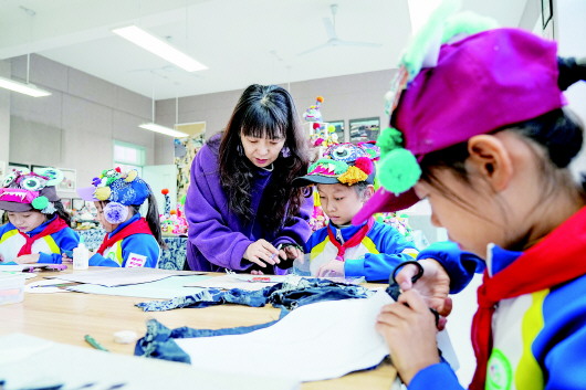 10月22日,淄博市博山区四十亩地小学教师韩晓英在辅导学生创作布贴画。