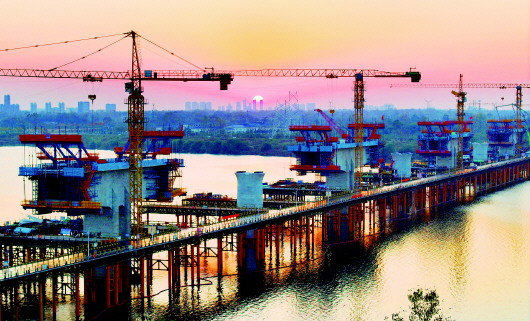 11月11日傍晚,金安区城北镇境内,合武高铁六安淠河特大桥(金裕淠河特大桥)紧张的施工现场与天边绚丽的晚霞交相辉映,构成一幅壮美的初冬施工画卷。 近日,随着合武高铁(安徽段)900吨架桥机顺利完成首榀32米预制箱梁架设,标志着该项目安徽段全线首榀由架桥机实施的箱梁架设任务圆满完成,为后续桥面系施工奠定坚实基础。据悉,新建合(肥)至武(汉)高铁是国家“八纵八横”高铁网沿江通道的重要组成部分,线路总长约360.6公里,设计时速350公里,其中安徽段新建正线166公里。项目建成后,将进一步优化长江经济带铁路网布局,极大便利沿线群众出行,对加快构建沿江综合交通运输体系、促进区域协调发展、推动长江经济带高质量发展具有重要意义。 本报记者 田凯平 摄