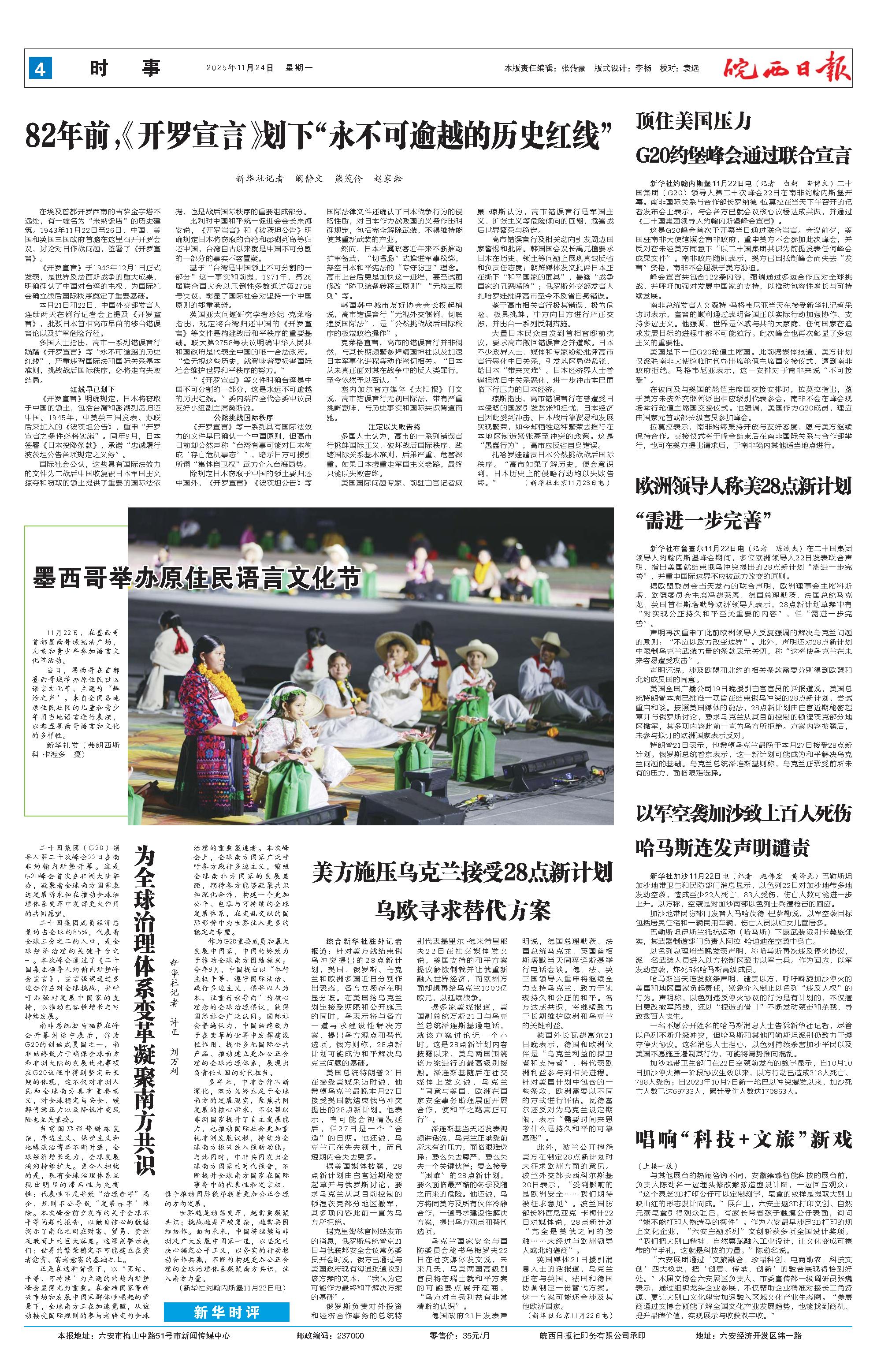 新华社约翰内斯堡11月22日电(记者 白舸 靳博文)二十国集团(G20)领导人第二十次峰会22日在南非约翰内斯堡开幕。南非国际关系与合作部长罗纳德·拉莫拉在当天下午召开的记者发布会上表示,与会各方已就会议核心议程达成共识,并通过《二十国集团领导人约翰内斯堡峰会宣言》。 这是G20峰会首次于开幕当日通过联合宣言。会议前夕,美国驻南非大使馆照会南非政府,重申美方不会参加此次峰会,并反对在未经美方同意下“以二十国集团共识为前提发表任何峰会成果文件”。南非政府随即表示,美方已因抵制峰会而失去“发言”资格,南非不会屈服于美方胁迫。 峰会宣言共包含122条内容,强调通过多边合作应对全球挑战,并呼吁加强对发展中国家的支持,以推动包容性增长与可持续发展。 南非总统发言人文森特·马格韦尼亚当天在接受新华社记者采访时表示,宣言的顺利通过表明各国正以实际行动加强协作、支持多边主义。他强调,世界是休戚与共的大家庭,任何国家在追求发展目标的进程中都不可能独行。此次峰会也再次彰显了多边主义的重要性。 美国是下一任G20轮值主席国。此前据媒体报道,美方计划仅派驻南非大使馆临时代办出席轮值主席国交接仪式,遭到南非政府拒绝。马格韦尼亚表示,这一安排对于南非来说“不可接受”。 在被问及与美国的轮值主席国交接安排时,拉莫拉指出,鉴于美方未按外交惯例派出相应级别代表参会,南非不会在峰会现场举行轮值主席国交接仪式。他强调,美国作为G20成员,理应由国家元首或部长级官员参加峰会。 拉莫拉表示,南非始终秉持开放与友好态度,愿与美方继续保持合作。交接仪式将于峰会结束后在南非国际关系与合作部举行,也可在美方提出请求后,于南非境内其他适当地点进行。