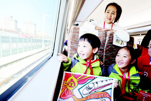 12月7日,师生代表在延安站开往西安北站的复兴号动车组列车上观赏沿途风景。 12月7日,来自西安、延安、铜川、渭南四市的西延高铁沿线居民及中小学师生代表参加西延高铁爱路护路主题宣传活动。 目前,西延高铁运行试验的各项调试工作稳步推进,线路已具备安全体验条件,即将迎来正式运营。西延高铁是陕北革命老区的首条高铁,线路全长299.8公里,设计时速350公里。 新华社发 (刘翔 摄)