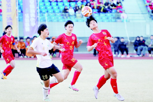 12月14日,由安徽省体育局、安徽省教育厅、六安市人民政府主办,六安市教育体育局、安徽省足球运动协会承办的安徽省青少年足球联赛男子高中组乙组(六安赛区)第四场比赛在六安市体育中心激情开赛。绿茵场上,六安队与宣城队的队员为现场2000余名观众呈现了一场精彩的攻防大战,最终双方以0:0战平。 据悉,安徽省青少年足球联赛以“爱足球、一起嗨”为主题,坚持体教融合、以赛育人,通过高水平赛事,为青少年足球运动员提供展示球技的舞台,发现和培养青少年足球后备人才。图为六安队队员(红色)与宣城队队员(白色)在比赛中争球。 本报记者 田凯平 摄