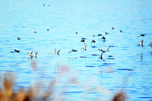12月14日,一群野鸭在淠河国家湿地公园水面上飞舞觅食。