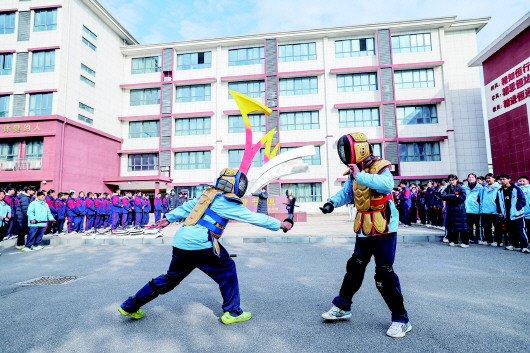 12月16日,轧村中学的学生们在阳光大课间活动中进行武术短兵训练。