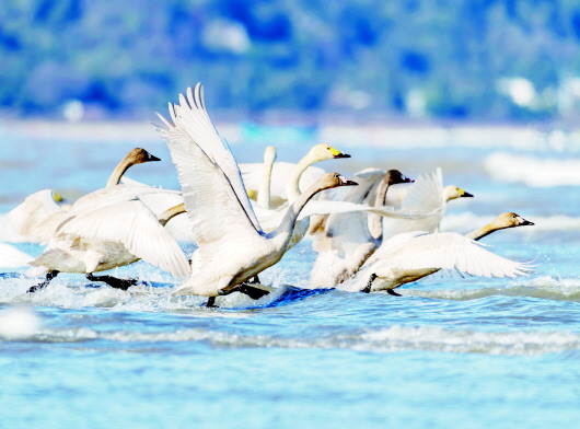 福州闽江河口湿地是东亚-澳大利西亚候鸟迁徙的重要驿站。每年冬季,这里迎来众多小天鹅,它们常聚集在湿地滩涂停歇觅食,或在湿地上空组队翱翔,形成壮观“白色鸟浪”。
