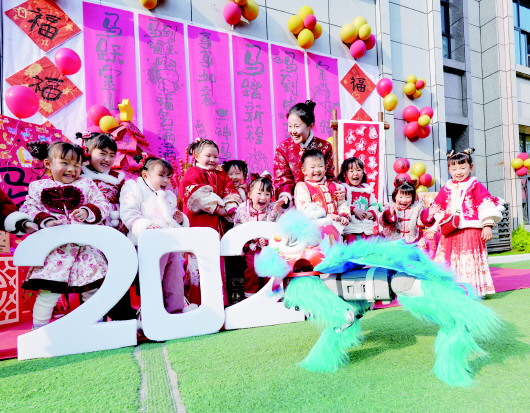 1月14日,四川省遂宁市高新区瑰宝明珠幼儿园举办迎新春非遗庙会,一只身披舞狮服的机器狗在活动上亮相,为师生送来温馨祝福。 新华社发 钟敏 摄