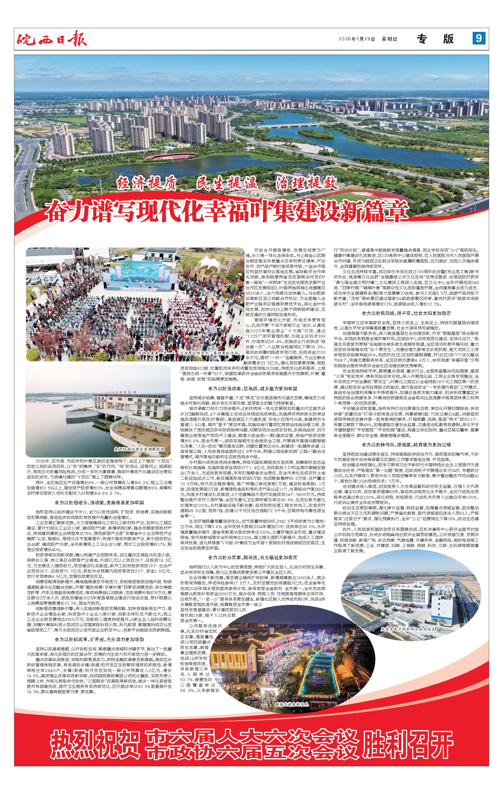 2025年,在市委、市政府和叶集区委的坚强领导下,全区上下锚定“十四五”收官之战的各项目标,以“拼”的精神、“实”的作风、“闯”的劲头,迎难而上、砥砺前行,有效应对多重风险挑战,办成一系列大事要事,推动叶集现代化建设迈出更加坚实的步伐,为波澜壮阔的“十四五”画上了圆满句号。 预计,全区地区生产总值增长6%,一般公共预算收入增长6.2%,规上工业增加值增长3.5%以上,固定资产投资增长2%,社会消费品零售总额增长8%,城镇和农村常住居民人均可支配收入分别增长4.8%、6.7%。 全力以赴稳增长、强动能,发展根基更加牢固 始终坚持以经济建设为中心,全力以赴优结构、扩投资、促消费,实施创新驱动发展战略,推动经济实现质的有效提升和量的合理增长。 工业发展汇聚新优势。大力培育精细化工和化工新材料产业,加快化工园区建设,累计引进化工企业10家,建成投产5家、新增纳规2家;稳步发展家居板材产业,传统建筑模板企业转型率达75%,绿色家居产业获“安徽省中小企业特色产业集群”认定,智能化、绿色化水平显著提升;快速引育纺织服装产业,新引进纺织企业44家、建成投产35家。全年新增规上工业企业10家,预计工业投资增长17%,制造业投资增长40%。 投资领域实现新突破。精心构建产业招商体系,设立重点区域驻点攻坚小组,深耕长三角、珠三角及合肥等产业高地。引进亿元以上项目28个,总投资74.3亿元,为发展注入强劲动力。项目建设扎实推进。新开工政府投资项目18个、社会产业项目26个,总投资70.7亿元;获批中央预算内投资等项目23个、资金1.8亿元;发行专项债券4.9亿元,发展后劲更加充足。 消费动能得到新提升。精准施策激发市场活力,系统推进商贸设施升级、物流通道畅通与业态融合创新。开展“徽动消费·乐享叶集”四季促消费活动,举办啤酒龙虾季、汽车及商超促消费活动,推动消费品以旧换新,发放消费补贴876万元,惠及群众3万余人次,获批安徽省2025年度县域商业建设行动试点县,预计限额以上消费品零售额增长13.3%,居全市前列。 创新驱动塑造新引擎。深入实施创新驱动发展战略,加快培育新质生产力,高新技术企业增至46家,科技型中小企业入库97家,创新主体队伍不断壮大。规上工业企业研发费用达8500万元,创新投入强度持续提升。9家企业入驻科技孵化器,安徽叶集梨科技小院成功认定国家级科技小院,科凡家居、聚塑高科成功认定省级绿色工厂,南方水泥成功认定市级企业研发中心,创新平台能级实现新跨越。 全力以赴抓改革、扩开放,内生动力更加强劲 坚持以改革破难题、以开放拓空间,聚焦重点领域和关键环节,推出了一批重大改革举措,深化多层次的区域合作,发展的内生动力和外部活力进一步释放。 重点改革纵深推进,体制机制更具活力。财税金融改革激发新潜能。推动区乡财政管理体制改革,有效调动乡镇(街道)和开发区生财聚财理财的积极性,新增纳税主体2640户,乡镇(街道)和开发区实现一般公共预算收入2亿元,增长14.6%。国资国企改革实现新突破。完成皖西国投集团公司优化重组,实现负责人竞聘上岗,市场化转型步伐加快。“三医联动”改革取得新成效。城乡一体化紧密型医共体组建完成,医疗卫生服务体系持续优化,区内就诊率从63.8%显著提升至74.3%,群众看病就医更方便、更实惠。 开放合作提质增效,发展空间更为广阔。长三角一体化走深走实。与上海金山区联合制定落实年度重点任务和责任清单,产业协作、农产品产销对接成果丰硕,六金合作园区利益共享协议落地生根。省际毗邻合作率先突破。推动皖豫两省发改委联合印发《叶集—固始“一河两岸”生态优先绿色发展产业合作区发展规划》,叶固两地同城化待遇惠及4500余人。合六同城化加快融入。与合肥新站高新区签订战略合作协议,为全面融入合肥产业链供应链提供更优平台。深化金叶协同发展,加快G529上跨宁西铁路桥建设,互联互通的交通网络加速形成。 营商环境优化升级,市场主体更有信心。扎实开展“千名干部联万企”走访,认真实施2025年惠企助企“十大海”行动,通过“13357”闭环管理机制,办结企业诉求399件,办结率达99.4%。实施涉企行政执法“综合查一次”,入企联合检查同比下降36.2%。落实政府履约践诺专项行动,兑现资金3700余万元。提供“一对一”金融服务,为企业解决融资需求23.5亿元。强化项目要素保障,报批项目用地913亩,处置批而未供和闲置低效用地1839亩。持续优化政务服务,上线“高效办成一件事”53个,综窗改革获评全省政务服务效能提升示范案例,叶集“重商、亲商、安商”的品牌更加响亮。 全力以赴强功能、优品质,城乡魅力更加彰显 坚持城乡统筹、建管并重,下足“绣花”功夫推进城市内涵式发展,精准发力实施乡村振兴战略,城乡变化可观可感,宜居宜业的魅力持续彰显。 城市承载力吸引力同步提升。《史河两岸一体化发展规划和重点片区城市设计》已编制完成,4个乡镇国土空间总体规划完成审批。实施淠河两岸排水防涝设施改造提升项目(叶集段),推进城区人行道改造、住宅小区雨污分流,新建雨污水管道11.8公里,城市“里子”更加牢固。实施沿淮行蓄洪区等其他洼地治理工程,系统解决了困扰城区多年防洪除涝问题,如期实现水治民安目标。东润尚品府、四方塘商业街等地产项目开工建设,颐高文旅金街(一期)