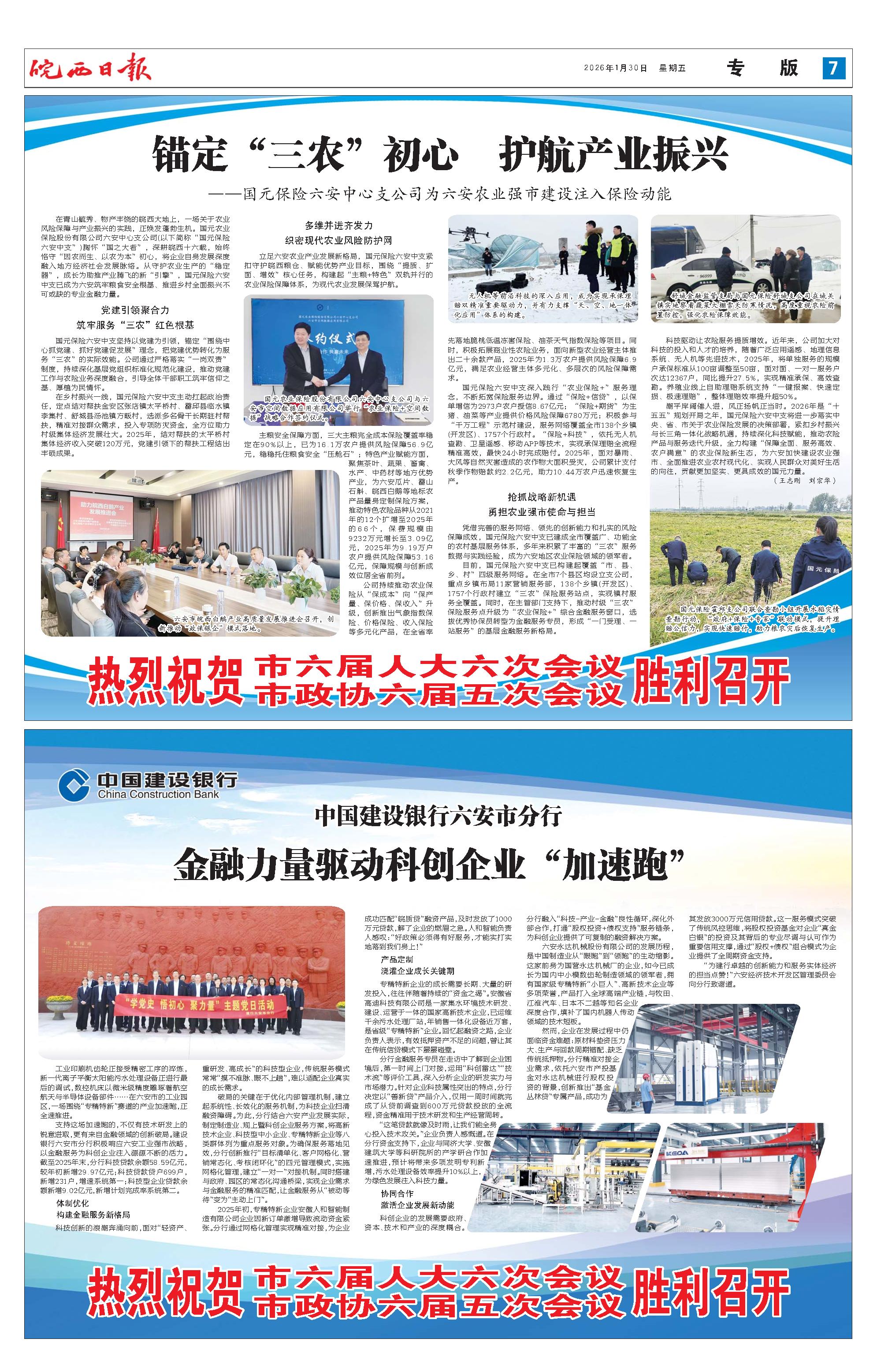 在青山毓秀、物产丰饶的皖西大地上,一场关于农业风险保障与产业振兴的实践,正焕发蓬勃生机。国元农业保险股份有限公司六安中心支公司(以下简称“国元保险六安中支”)胸怀“国之大者”,深耕皖西十六载,始终恪守“因农而生、以农为本”初心,将企业自身发展深度融入地方经济社会发展脉络。从守护农业生产的“稳定器”,成长为助推产业腾飞的新“引擎”,国元保险六安中支已成为六安筑牢粮食安全根基、推进乡村全面振兴不可或缺的专业金融力量。 党建引领聚合力 筑牢服务“三农”红色根基 国元保险六安中支坚持以党建为引领,锚定“围绕中心抓党建、抓好党建促发展”理念,把党建优势转化为服务“三农”的实际效能。公司通过严格落实“一岗双责”制度,持续深化基层党组织标准化规范化建设,推动党建工作与农险业务深度融合,引导全体干部职工筑牢信仰之基、厚植为民情怀。 在乡村振兴一线,国元保险六安中支主动扛起政治责任,定点结对帮扶金安区张店镇太平桥村、霍邱县临水镇李集村、舒城县汤池镇方畈村,选派多名骨干长期驻村帮扶,精准对接群众需求,投入专项防灾资金,全方位助力村级集体经济发展壮大。2025年,结对帮扶的太平桥村集体经济收入突破120万元,党建引领下的帮扶工程结出丰硕成果。 多维并进齐发力 织密现代农业风险防护网 立足六安农业产业发展新格局,国元保险六安中支紧扣守护皖西粮仓、赋能优势产业目标,围绕“提质、扩面、增效”核心任务,构建起“主粮+特色”双轨并行的农业保险保障体系,为现代农业发展保驾护航。 主粮安全保障方面,三大主粮完全成本保险覆盖率稳定在90%以上,已为16.1万农户提供风险保障56.9亿元,稳稳托住粮食安全“压舱石”;特色产业赋能方面,聚焦茶叶、蔬果、畜禽、水产、中药材等地方优势产业,为六安瓜片、霍山石斛、皖西白鹅等地标农产品量身定制保险方案,推动特色农险品种从2021年的12个扩增至2025年的66个,保费规模由9232万元增长至3.09亿元,2025年为9.19万户农户提供风险保障53.16亿元,保障规模与创新成效位居全省前列。 公司持续推动农业保险从“保成本”向“保产量、保价格、保收入”升级,创新推出气象指数保险、价格保险、收入保险等多元化产品,在全省率先落地脆桃低温冻害保险、油茶天气指数保险等项目。同时,积极拓展商业性农险业务,面向新型农业经营主体推出二十余款产品,2025年为1.3万农户提供风险保障6.9亿元,满足农业经营主体多元化、多层次的风险保障需求。 国元保险六安中支深入践行“农业保险+”服务理念,不断拓宽保险服务边界。通过“保险+信贷”,以保单增信为2973户农户授信8.67亿元;“保险+期货”为生猪、油菜等产业提供价格风险保障6780万元;积极参与“千万工程”示范村建设,服务网络覆盖全市138个乡镇(开发区)、1757个行政村。“保险+科技”,依托无人机查勘、卫星遥感、移动APP等技术,实现承保理赔全流程精准高效,最快24小时完成赔付。2025年,面对暴雨、大风等自然灾害造成的农作物大面积受灾,公司累计支付秋季作物赔款约2.2亿元,助力10.44万农户迅速恢复生产。 抢抓战略新机遇 勇担农业强市使命与担当 凭借完善的服务网络、领先的创新能力和扎实的风险保障成效,国元保险六安中支已建成全市覆盖广、功能全的农村基层服务体系,多年来积累了丰富的“三农”服务数据与实践经验,成为六安地区农业保险领域的领军者。 目前,国元保险六安中支已构建起覆盖“市、县、乡、村”四级服务网络。在全市7个县区均设立支公司,重点乡镇布局11家营销服务部,138个乡镇(开发区)、1757个行政村建立“三农”保险服务站点,实现镇村服务全覆盖。同时,在主管部门支持下,推动村级“三农”保险服务点升级为“农业保险+”综合金融服务窗口,选拔优秀协保员转型为金融服务专员,形成“一门受理、一站服务”的基层金融服务新格局。 科技驱动让农险服务提质增效。近年来,公司加大对科技的投入和人才的培养,随着广泛应用遥感、地理信息系统、无人机等先进技术,2025年,将单独服务的规模户承保标准从100亩调整至50亩,面对面、一对一服务户次达12367户,同比提升27.5%,实现精准承保、高效查勘。养殖业线上自助理赔系统支持“一键报案、快速定损、极速理赔”,整体理赔效率提升超50%。 潮平岸阔催人进,风正扬帆正当时。2026年是“十五五”规划开局之年,国元保险六安中支将进一步落实中央、省、市关于农业保险发展的决策部署,紧扣乡村振兴与长三角一体化战略机遇,持续深化科技赋能,推动农险产品与服务迭代升级,全力构建“保障全面、服务高效、农户满意”的农业保险新生态,为六安加快建设农业强市、全面推进农业农村现代化、实现人民群众对美好生活的向往,贡献更加坚实、更具成效的国元力量。 (王志刚 刘宗华) 国元保险霍邱支公司联合查勘小组开展水稻灾情查勘行动,“政府+保险+专家”联动模式,提升理赔公信力,实现快速赔付,助力粮农灾后恢复生产。