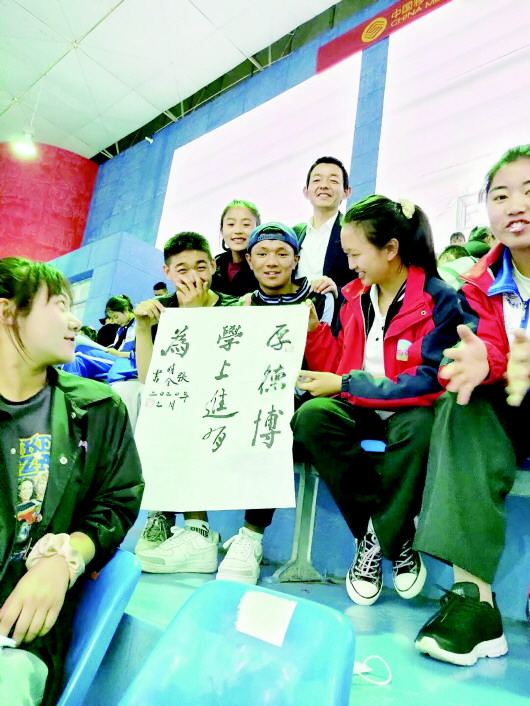 高考前,张明全(后排正中)以书法寄语,为西藏山南市第二高级中学的高三学生们加油助威。(资料图片)