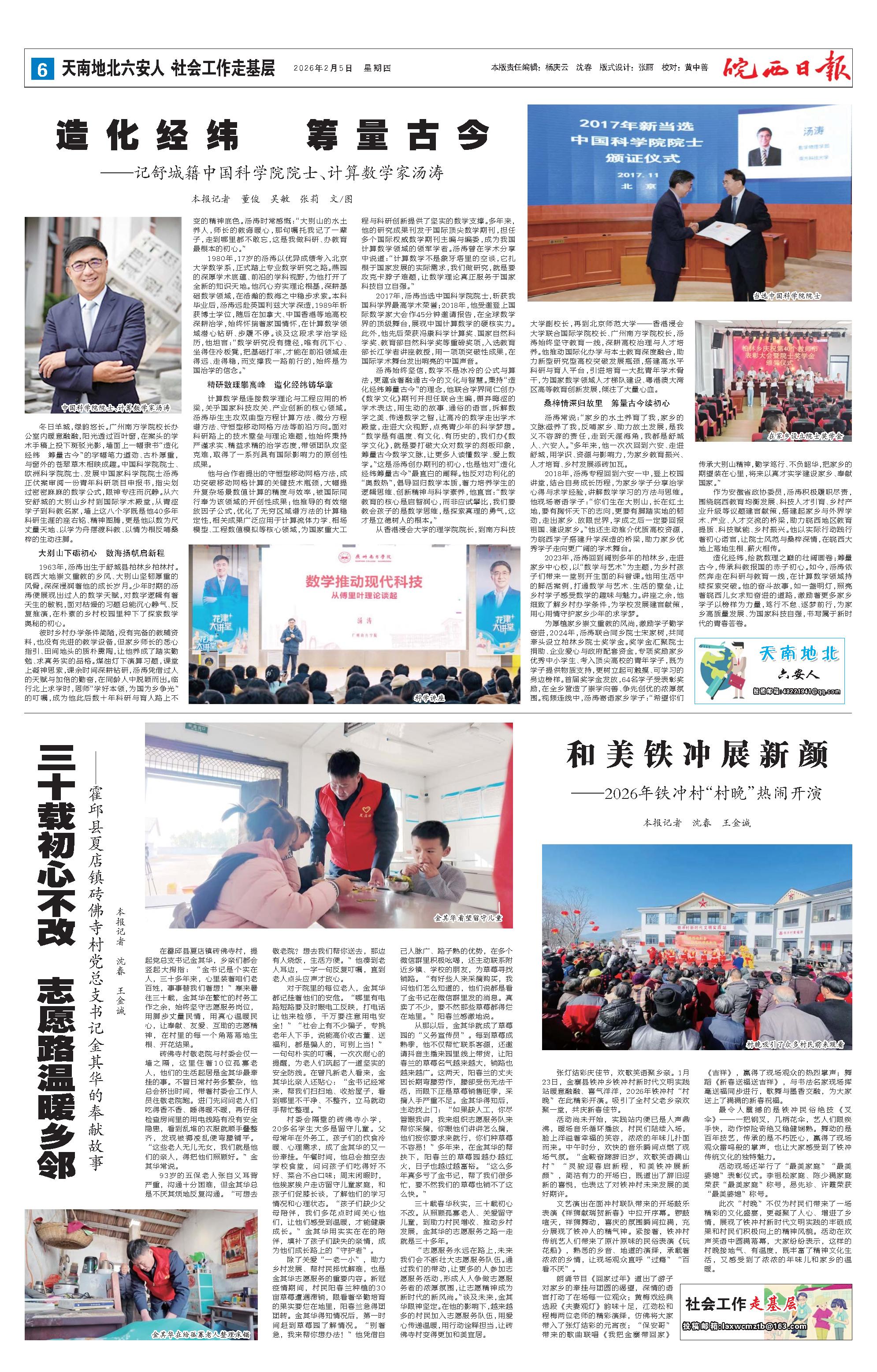 冬日羊城,绿韵悠长。广州南方学院校长办公室内暖意融融,阳光透过百叶窗,在案头的学术手稿上投下斑驳光影,墙面上一幅隶书“造化经纬 筹量古今”的字幅笔力遒劲、古朴厚重,与窗外的苍翠草木相映成趣。中国科学院院士、欧洲科学院院士、发展中国家科学院院士汤涛正伏案审阅一份青年科研项目申报书,指尖划过密密麻麻的数学公式,眼神专注而沉静。从六安舒城的大别山乡村到国际学术殿堂,从青涩学子到科教名家,墙上这八个字既是他40多年科研生涯的座右铭、精神图腾,更是他以数为尺丈量天地、以学为舟摆渡科教、以情为根反哺桑梓的生动注脚。 大别山下砺初心 数海扬帆启新程 1963年,汤涛出生于舒城县柏林乡柏林村。皖西大地崇文重教的乡风、大别山坚韧厚重的风骨,深深浸润着他的成长岁月。少年时期的汤涛便展现出过人的数学天赋,对数字逻辑有着天生的敏锐,面对枯燥的习题总能沉心静气、反复推演,在朴素的乡村校园里种下了探索数学奥秘的初心。 彼时乡村办学条件简陋,没有完备的教辅资料,也没有先进的教学设备,但家乡师长的悉心指引、田间地头的质朴熏陶,让他养成了踏实勤勉、求真务实的品格。煤油灯下演算习题,课堂上凝神思索,课余时间深耕钻研,汤涛凭借过人的天赋与加倍的勤奋,在同龄人中脱颖而出。临行北上求学时,恩师“学好本领,为国为乡争光”的叮嘱,成为他此后数十年科研与育人路上不变的精神底色。汤涛时常感慨:“大别山的水土养人,师长的教诲暖心,那句嘱托我记了一辈子,走到哪里都不敢忘,这是我做科研、办教育最根本的初心。” 1980年,17岁的汤涛以优异成绩考入北京大学数学系,正式踏上专业数学研究之路。燕园的深厚学术底蕴、前沿的学科视野,为他打开了全新的知识天地。他沉心夯实理论根基,深耕基础数学领域,在浩瀚的数海之中稳步求索。本科毕业后,汤涛远赴英国利兹大学深造,1989年斩获博士学位,随后在加拿大、中国香港等地高校深耕治学,始终怀揣着家国情怀,在计算数学领域潜心钻研、步履不停。谈及这段求学治学经历,他坦言:“数学研究没有捷径,唯有沉下心、坐得住冷板凳,把基础打牢,才能在前沿领域走得远、走得稳,而支撑我一路前行的,始终是为国治学的信念。” 精研数理攀高峰 造化经纬铸华章 计算数学是连接数学理论与工程应用的桥梁,关乎国家科技攻关、产业创新的核心领域。汤涛毕生主攻双曲型方程计算方法、微分方程谱方法、守恒型移动网格方法等前沿方向。面对科研路上的技术壁垒与理论难题,他始终秉持严谨求实、精益求精的治学态度,带领团队攻坚克难,取得了一系列具有国际影响力的原创性成果。 他与合作者提出的守恒型移动网格方法,成功突破移动网格计算的关键技术瓶颈,大幅提升复杂场景数值计算的精度与效率,被国际同行奉为该领域的开创性成果;他推导的有效缩放因子公式,优化了无穷区域谱方法的计算稳定性,相关成果广泛应用于计算流体力学、相场模型、工程数值模拟等核心领域,为国家重大工程与科研创新提供了坚实的数学支撑。多年来,他的研究成果刊发于国际顶尖数学期刊,担任多个国际权威数学期刊主编与编委,成为我国计算数学领域的领军学者。汤涛曾在学术分享中说道:“计算数学不是象牙塔里的空谈,它扎根于国家发展的实际需求,我们做研究,就是要攻克卡脖子难题,让数学理论真正服务于国家科技自立自强。” 2017年,汤涛当选中国科学院院士,斩获我国科学界最高学术荣誉;2018年,他受邀登上国际数学家大会作45分钟邀请报告,在全球数学界的顶级舞台,展现中国计算数学的硬核实力。此外,他先后荣获冯康科学计算奖、国家自然科学奖、教育部自然科学奖等重磅奖项,入选教育部长江学者讲座教授,用一项项突破性成果,在国际学术舞台发出响亮的中国声音。 汤涛始终坚信,数学不是冰冷的公式与算法,更蕴含着融通古今的文化与智慧。秉持“造化经纬筹量古今”的理念,他联合学界同仁创办《数学文化》期刊并担任联合主编,摒弃晦涩的学术表达,用生动的故事、通俗的语言,拆解数学之美、传递数学之智,让高冷的数学走出学术殿堂,走进大众视野,点亮青少年的科学梦想。“数学是有温度、有文化、有历史的,我们办《数学文化》,就是要打破大众对数学的刻板印象,筹量古今数学文脉,让更多人读懂数学、爱上数学。”这是汤涛创办期刊的初心,也是他对“造化经纬筹量古今”最直白的阐释。他反对功利化的“奥数热”,倡导回归数学本质,着力培养学生的逻辑思维、创新精神与科学素养,他直言:“数学教育的核心是启智润心,而非应试攀比,我们要教会孩子的是数学思维,是探索真理的勇气,这才是立德树人的根本。” 从香港浸会大学的理学院院长,到南方科技大学副校长,再到北京师范大学——香港浸会大学联合国际学院校长、广州南方学院校长,汤涛始终坚守教育一线,深耕高校治理与人才培养。他推动国际化办学与本土教育深度融合,助力新型研究型高校突破发展瓶颈,搭建高水平科研与育人平台,引进培育一大批青年学术骨干,为国家数学领域人才梯队建设、粤港澳大湾区高等教育创新发展,倾注了大量心血。 桑梓情深归故里 筹量古今续初心 汤涛常说:“家乡的水土养育了我,家乡的文脉滋养了我,反哺家乡、助力故土