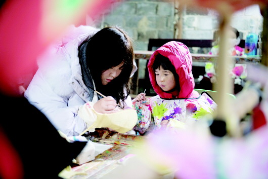 2月7日,在安徽省黄山市黟县碧山村,小朋友和家长体验鱼灯制作。