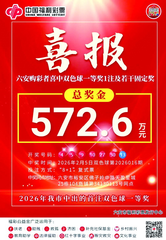 572.6万元!我市购彩者喜中2026年六安首注福彩双色球一等奖