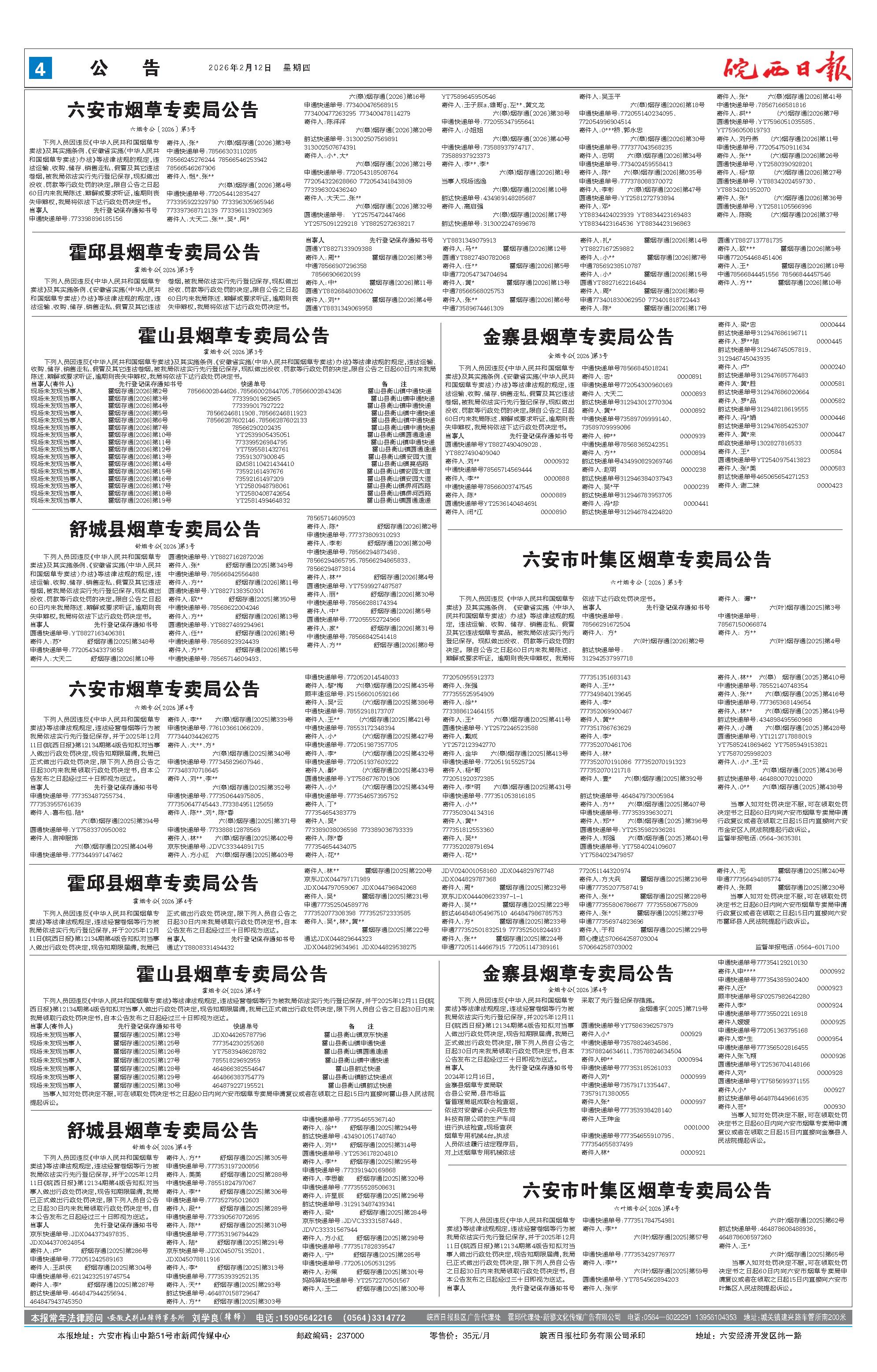 下列人员因违反《中华人民共和国烟草专卖法》等法律法规规定,违法经营卷烟等行为被我局依法实行先行登记保存,并2025年12月11日《皖西日报》第12134期第4版告知拟对当事人做出行政处罚决定,现告知期限届满,我局已正式做出行政处罚决定,限下列人员自公告之日起30日内来我局领取行政处罚决定书,自本公告发布之日起经过三十日即视为送达。 当事人 先行登记保存通知书号 2024年12月16日, 金寨县烟草专卖局联 合县公安局、县市场监 督管理局组成联合检查组, 依法对安徽省小尖兵生物 科技有限公司的生产车间 进行执法检查。现场查获 烟草专用机械4台。执法 人员依法履行法定程序后, 对上述烟草专用机械依法 采取了先行登记保存措施。 金烟通字〔2025〕第719号