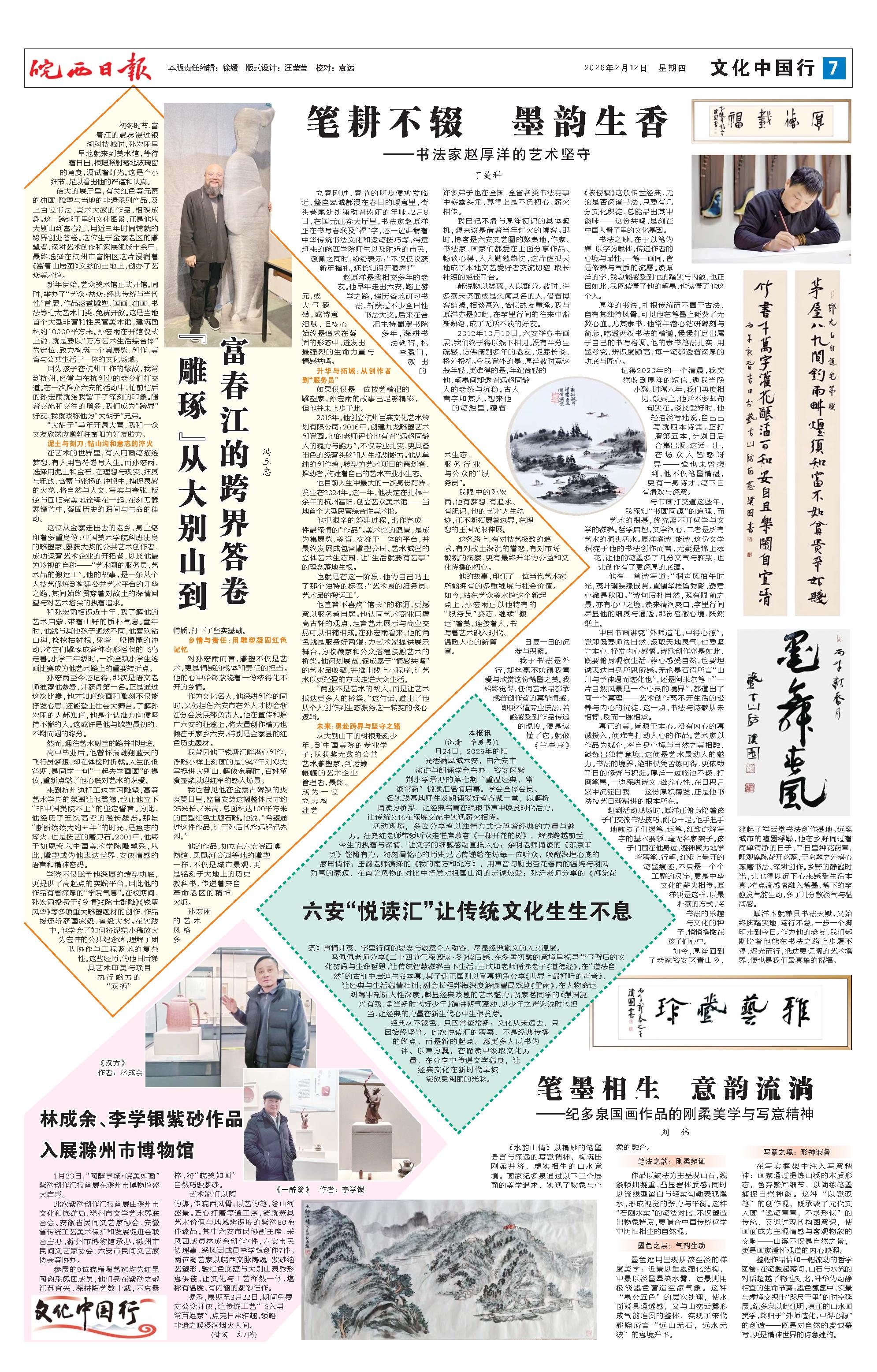 1月23日,“陶醉亭城·皖美如画”紫砂创作汇报首展在滁州市博物馆盛大启幕。 此次紫砂创作汇报首展由滁州市文化和旅游局、滁州市文学艺术界联合会、安徽省民间文艺家协会、安徽省传统工艺美术保护和发展促进会联合主办,滁州市博物馆承办,滁州市民间文艺家协会、六安市民间文艺家协会等协办。 参展的9位皖籍陶艺家均为红星陶韵采风团成员,他们身在紫砂之都江苏宜兴,深耕陶艺数十载,不忘桑梓,将“皖美如画”自然巧融紫砂。 艺术家们以陶为媒,传皖西风骨;以艺为笔,绘山河盛景。匠心打磨每道工序,铸就兼具艺术价值与地域辨识度的紫砂80余件臻品。其中六安市民协副主席、采风团成员林成余创作7件,六安市民协理事、采风团成员李学银创作7件。两位陶艺家以皖西文脉铸魂、紫砂绝艺塑形,融红色底蕴与大别山灵秀形意俱佳,让文化与工艺浑然一体,堪称有温度、有内涵的紫砂佳作。 据悉,展期至3月22日,期间免费对公众开放,让传统工艺“飞入寻常百姓家”,点亮日常雅趣,领略非遗之暖浸润烟火人间。 (甘宏 文/图)