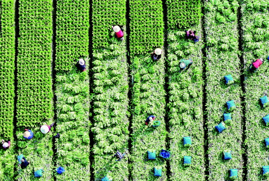 2月24日,农民在四川成都市彭州市九尺镇玉源社区的田地里采收油麦菜(无人机照片)。
