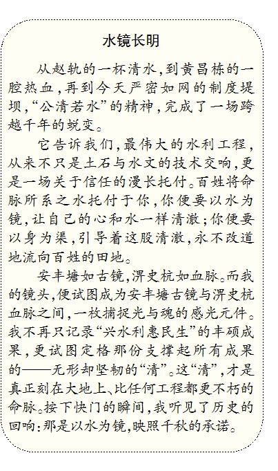 它告诉我们,最伟大的水利工程,从来不只是土石与水文的技术交响,更是一场关于信任的漫长托付。百姓将命脉所系之水托付于你,你便要以水为镜,让自己的心和水一样清澈;你便要以身为渠,引导着这股清澈,永不改道地流向百姓的田地。