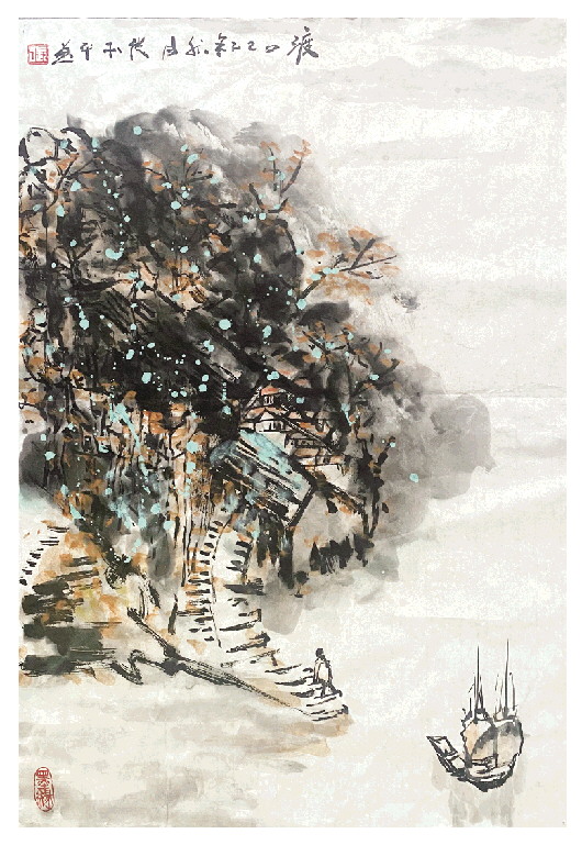 他的国画作品《渡口》,用小写意的笔触描绘出一个渡口的场景,画面疏密结合,展现出山的温暖、水的圆转,寓意人生的每一个渡口都是一次人生际遇的挑战,让我想到一句诗:“乘风破浪会有时,直挂云帆济沧海。”