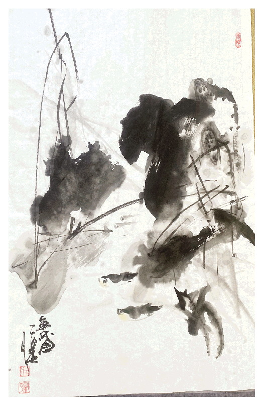 在《鱼乐图》作品中,作者用水墨描写出鱼游残荷间的自在。从画面整体来看,画风雅逸有趣,残荷的朴素之美,近景鱼的肥硕与憨态也表达了作者对生活的满足感。但这张画也有不足之处,如鱼的姿态不够鲜活,鱼的眼神有点呆滞等。