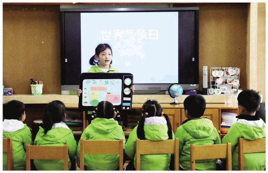 3月23日,在江苏省苏州市平江实验幼儿园,一名小朋友向同伴播报当天天气。