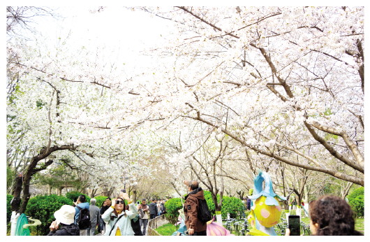 近日,山东省济南市气温回升,五龙潭公园内大面积种植的樱花进入盛开期,吸引众多市民前来观赏。