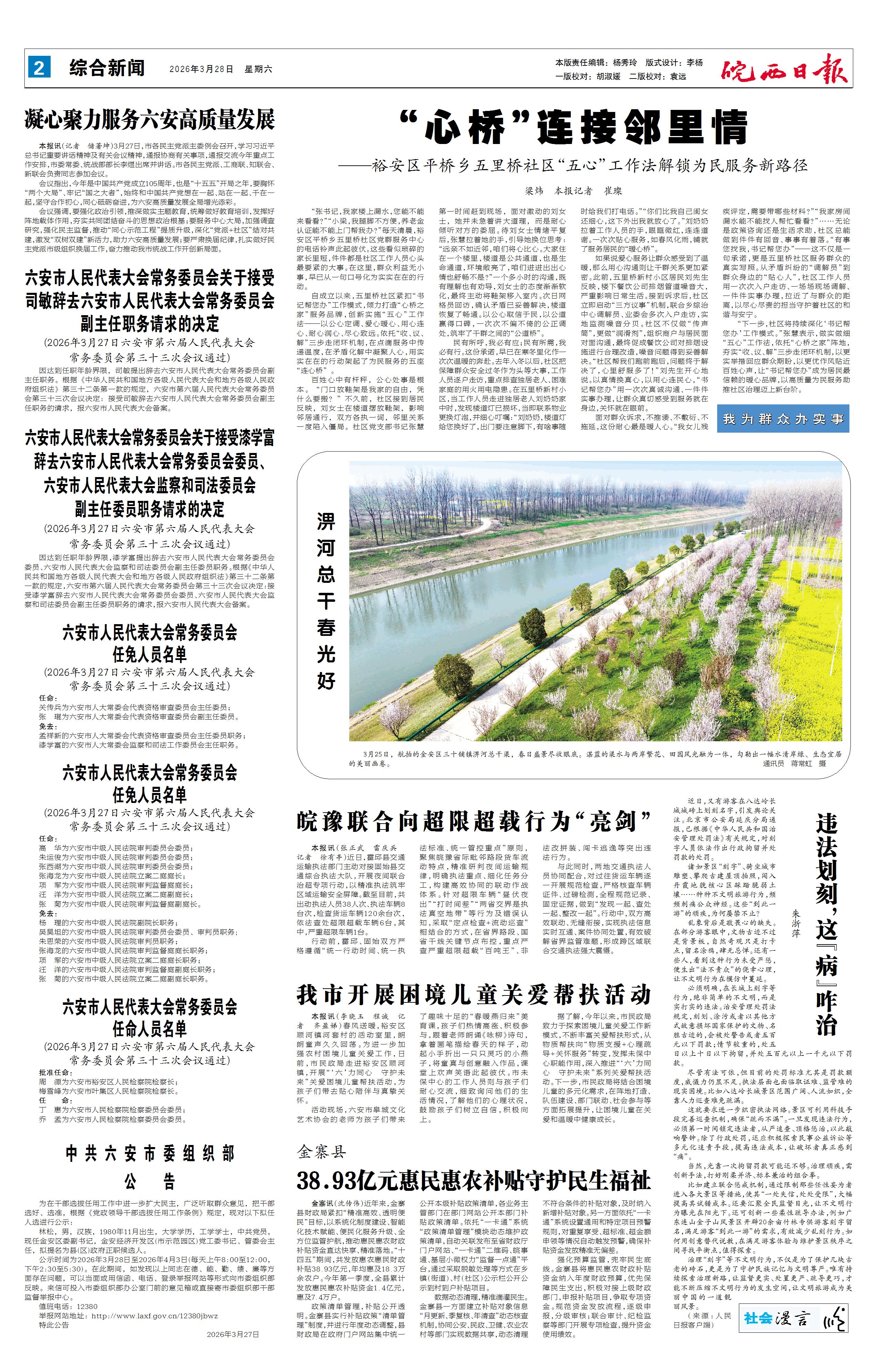 本报讯(李晓玉 程诚 记者 齐盈娣)春风送暖,裕安区顺河镇河套村的活动室里,朗朗童声久久回荡。为进一步加强农村困境儿童关爱工作,日前,市民政局走进裕安区顺河镇,开展“‘六’力同心 守护未来”关爱困境儿童帮扶活动,为孩子们带去贴心陪伴与真挚关怀。
