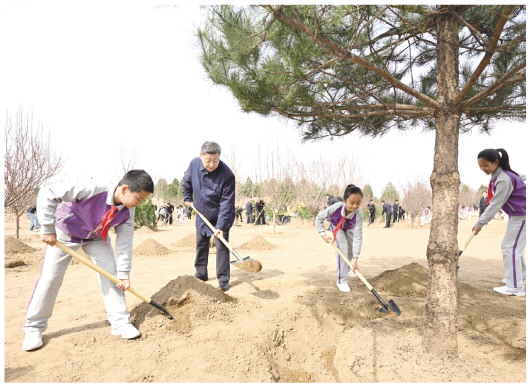 新华社北京3月30日电 中共中央总书记、国家主席、中央军委主席习近平30日上午在参加首都义务植树活动时强调,良好生态人人共享,也需要合力共建。要组织动员全社会广泛参与植树造林,为山川大地增添锦绣,让中国式现代化的底色更加亮丽。 首都北京春风和煦、万物生发。上午10时40分许,党和国家领导人习近平、李强、赵乐际、王沪宁、蔡奇、丁薛祥、李希等集体乘车,来到昌平区百善镇,同干部群众一起参加义务植树。 植树点为规划公园用地,公园建成后将为群众提供生态休闲空间。 看到总书记来了,正在植树的干部群众纷纷热情地向总书记问好。习近平向大家挥手致意,拿起铁锹走向植树现场,同在场的北京市、国家林草局负责同志和干部群众、少先队员一起忙碌起来。 挥锹铲土、培土围堰、提水浇灌……习近平接连种下油松、北京牡丹、榆叶梅、杜仲、元宝枫等多棵树苗。他一边植树,一边询问孩子们的学习生活、劳动锻炼和参加植树情况。习近平强调,青少年像小树苗一样充满活力和希望,要从小树立远大志向,爱知识、爱劳动、爱自然,德智体美劳全面发展,努力成长为栋梁之材。现场气氛热烈,一派繁忙景象。 习近平同在场的干部群众亲切交谈。他说,党的十八大以来,我国森林面积和蓄积量持续“双增长”,荒漠化和沙化土地面积持续“双缩减”,是全球增绿最多最快的国家,天蓝地绿水清已经成为常态。前不久,我国颁布生态环境法典,进一步筑牢了美丽中国建设的法治基石。植树造林是美丽中国建设的一项重要任务,要咬定青山不放松,立足当下、着眼长远、接力奋进,把这件利国利民的大事扎实做好。 习近平强调,今年是“十五五”开局之年,也是全民义务植树运动开展45周年。新形势下推进国土绿化,要更加注重提质、兴业、利民,实现种与管共抓、生态与产业共促、人与自然共生。要统筹利用绿化空间,以地定绿、以水定绿,因地制宜做好增绿文章,宜树则树,宜草则草。要下更大气力加强管护,分区分类开展森林可持续经营,有力有效推进草原保护修复,全面提升林草质量和功能,防火防虫护好绿化成果。要畅通生态产品价值转化渠道,壮大林草产业,同步提升经济价值和生态效益。要协同推进城乡绿化美化,见缝插针增加群众身边的绿地,让城乡居民有更多的绿色获得感。 在京中共中央政治局委员、中央书记处书记、国务委员等参加植树活动。