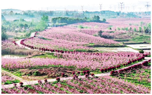 近年来,该乡在联合省农科院推广品种选择新优化、栽培模式机械化、土壤水肥一体化、绿色防控规范化、果品销售品牌化标准种植的同时,采取“协会+合作社+农户”模式,延伸桃产业链,开发桃酒、桃胶等产品,大力推进农文旅融合,带动农家乐兴起,昔日的荒坡地正描绘出强乡富民的乡村振兴新图景。