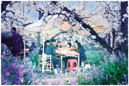 3月30日,游客在砀山县梨小萌欢乐梨园品尝梨园火锅。