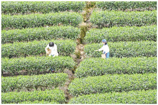 4月5日,人们在四川省雅安市牛碾坪万亩观光茶园体验采茶。