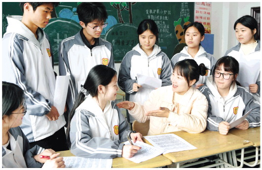 近日,霍邱县霍邱中学辩论社团的队员们在学生会指导老师卢苇(前右二)的指导下练习辩论技巧。