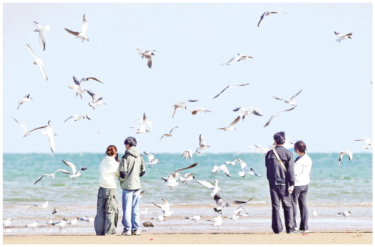 4月7日,游客在河北省秦皇岛市北戴河区沿海地区观看海鸥飞舞。